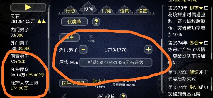 重要的话先来个三遍:本游戏不用氪金,本游戏不用氪金,本游戏不用氪金好了,我们开门见山,以下是让你可以不用氪金的宗门资源优化建议:1. 十人飞升目标达成会给1000点功德点,拿着直接去下一世好了,不用去再等庇护人数增长,性价比实在过低。见下图,我们可以看到289亿才可以把伏魔峰外门弟子屋舍升到lv60,而这时侯的庇护民众增速才到35.4每旬,而庇护上限这时候会远超你的庇护增速,楼主这一世是佛系