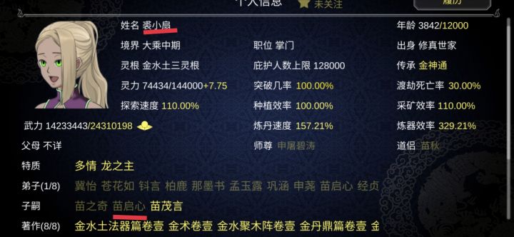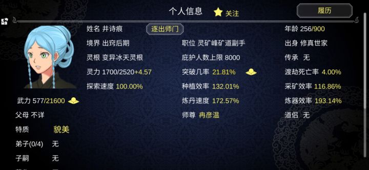 第一次双灵根开局,比看脸的杂灵根几率大多了。外门弟子:第一次全放在伏魔峰庇佑农民,这样农民会一直增加,加到四十万农民,有80功德就轮回。内门弟子:优先变异天灵根,一切为了发展。其次火属性单灵根或者火属性天灵根招募19个,一切为了丹药。轮回后还是不要杂灵根,虽然选气运之子,杂灵根注定逆袭,但是传承和变异会冲突,一旦先传承了,变异带来的帮助就弱很多了。选变异风天灵根,因为风灵根传承武力,再来个