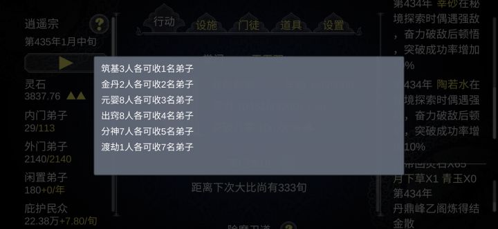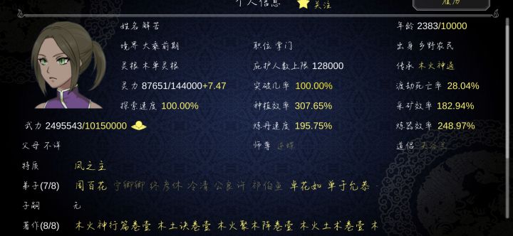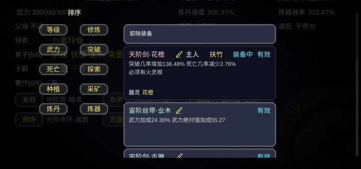 首先,这个游戏最核心的玩法就是SL大法,因为这个游戏是可以备份数据的,所以玩法就简单了,怎么发展我先不谈,我先说一下这个核心玩法。①造一件法宝,开启宗门大比(这里要注意的是,开启大比之前,选30年保存一次,然后手动保存),然后只选两类人,一类是自带天赋的(气运之子,凤之子,龙之子,无垢等),一类是自带装备,装备比你造的装备等级高的人,然后随便分配个低级的师傅,开始扒装备(点击名字--储物袋--没