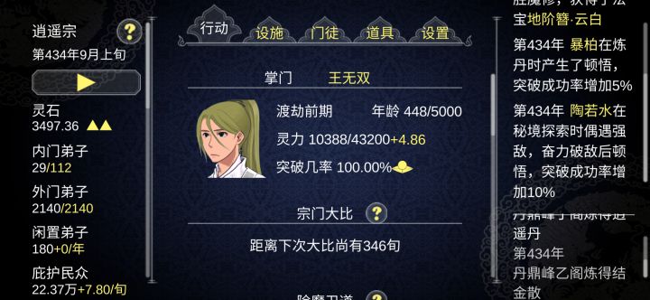 一周目,貌美,杂灵根,被包养,得高级法器,收人。(什么人都收,然后装备全扒掉)只开主峰,丹鼎峰,然后前期收人全拉去练药,练筑基丹和结金散(其他丹不练)养到金丹就别管了,让他有自己的机遇。前期只要普普通通就可以去打,疯狂刷,然后加收人,好装备先给掌门,然后开伏魔峰(不用安排人,就外门弟子那个点满,后期根本不够,提前刷,作者亲测,根本不够。)然后开功德,刷33点功德以上立即去死,转生2周目。二周目开