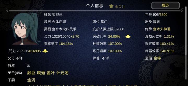 这两天推荐朋友玩,很多人都一脸懵逼,不知道前期怎么玩,我刚开始也是付出了一个掌门惨死的档,然后重开了两次,对于前期刚开局有点点心得,这里分享一下,各位新人可以借鉴一下这个攻略仅仅针对开局,在前期建立一个不会手忙脚乱的开局1.界面问题我看到很多帖子,评价还有朋友反馈,界面有哪些重要的部分都没弄清楚,这里就重点说一下。这个界面的左侧,是可以上下滑动的,能看到你的宗门的各种信息,注意界面所有带黄