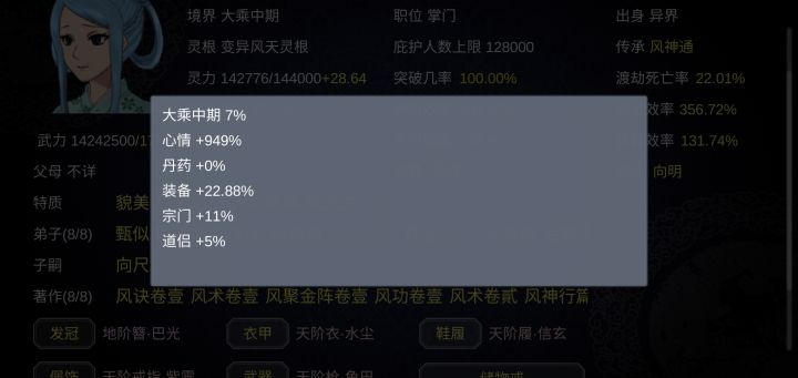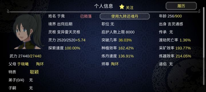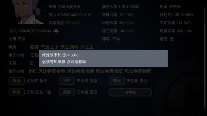 二周目开启But 气运之子这个真的好讨厌啊!一直出现,突破长期是100%给我一种就是在挂机,等时间的感觉啊。没有一点悬念!本掌门这个造型,难道不貌美么?这个貌美属性是假的吧!根本没有人给本掌门送礼物啊?连一个向本掌门求婚的都没有!!无垢灵体是断情绝爱一门心思修炼的意思么??