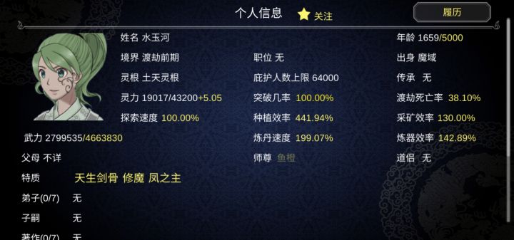每10年一次的弟子招募,不要落下。一直招下去。当弟子量大于200时。会触发各种各样的事件。屏幕能隔一会点一下。继续找各种装备就全部来了。弟子量大于500时,基本一分钟不到就有伴侣信息。我们同样可以查看伴侣信息。装备,境界都是可以的。意思就是:当弟子数量越来越大。事件触发率就高。各种装备,伴侣事件就多。完全不用培养了。就靠弟子在外面鬼混带伴侣回门派。我完全靠弟子带回来了10几个大乘期的伴侣