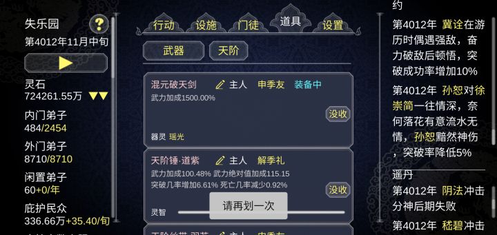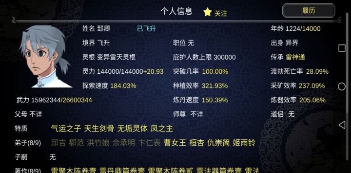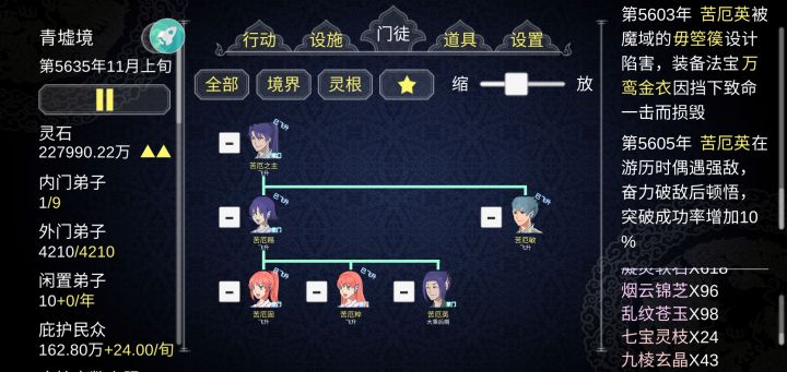 这是二周目,还是战斗流为核心,美貌(忽悠装备)气运(欧皇附体)剑体(战力爆表)核心掌门混装备,打钱打材料。弟子努力升级飞升,省的老是换掌门烦死了。