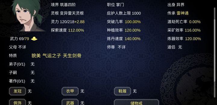 游戏刚开始前期三点功德步涌,随意灵根。进游戏以后游戏速度调整为最快。挖个灵材解锁炼制荒级装备。等待宗门大比。宗门大比之前手动存档,选择任意装备,刷弟子。主要看特质,天生剑骨和气运之子。刷不到就刷天灵根以上。然后掌门刷材料暴毙野外,高资质弟子继承掌门之位。掌门突破前手动存档,没成功就刷当。装备等级,天地玄黄宇宙洪荒,对应千字文开头第一句。资质等级由高到底,变异天灵脉,天灵脉,变异单灵脉