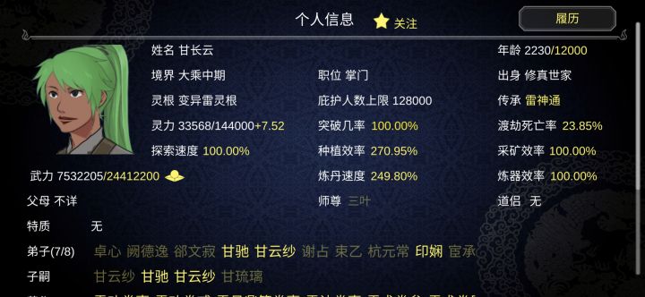先上个图,还没通关但是也到后期了,只要渡劫的时候不死应该就能飞升首先游戏整体还是挺好玩的,但是有些细节方面还有一些漏洞以至于游戏体验不是很完美。测试版嘛可以理解,期待优化我现在玩的是第一周目,还没有轮回过,目前进入轮回新周目可以拿到300多点功德,据说玩到飞升通关能有1000功德点。一开始游戏摸索阶段,掌门死了2个😭,直到第三任掌门小云云上位!开始了门派振兴大业。是因为小云云天赋异禀资质过