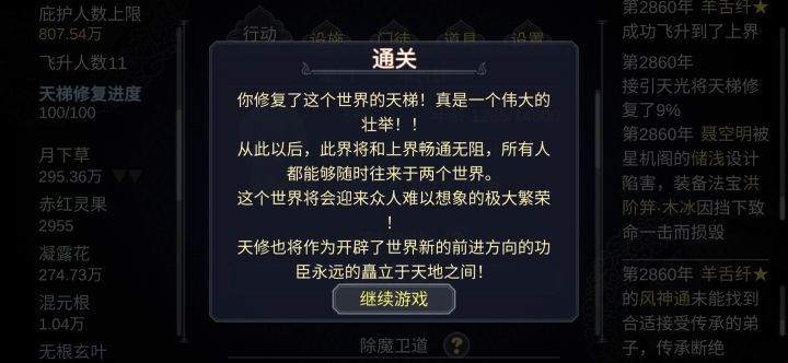 这个游戏有点意思,因为可s/l,所以有耐心的话,难度并不大。自动存档的时间,有时间操控的话,设30年,免得影响手动存档的安排,我一般设5年。开自动选择,晚上睡觉或者其他时间挂机的话,自动选择肯定需要,他会拒绝所有申请,不会招收一些其实还不错。这个游戏是有任务的,有一个终极任务:修补天梯,修补天梯需要飞升9-11个弟子,天梯修补完成送1000功德,初期已经算很大一笔财富了。比庇护民众获得的功德