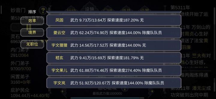 灵石见底很可怕的,全宗弟子修炼效率降低50%可是挂机太久弟子一堆,找灵石消耗大户眼都花了怎么办?利用除魔界面的战力排序做个标记就好找了,之前我几十个渡劫到合体终于安排好了。无职位弟子的排序实在是杂乱不利于安排,估计默认顺序是入门时间。我是太喜欢这个游戏了,特别希望这个游戏玩的人多,玩的久,然后作者努力更新,改善不足。这个帖子,主要是希望大家一起交流一些游戏技巧,特别是一些游戏内已有功能的