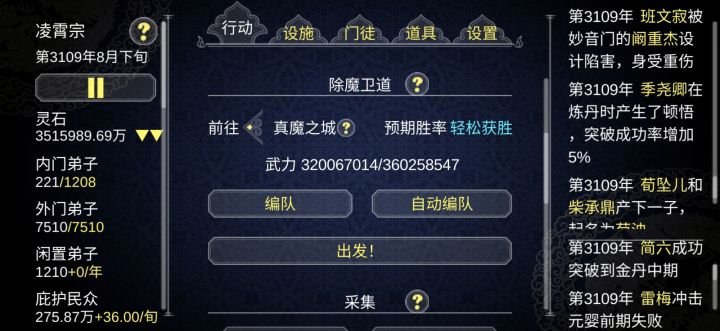 开始是这样,先集合,然后扒了武器只要锲而不舍的除魔卫道,就会成这样然后出了bug,有两个小强,怎么打都不掉战力,也不能收徒或写书,一个被我放逐了,另一个不小心当了掌门放逐不了,还有几十年的寿命,sl不让他突破老死了,终于剩下这样然后剩下的这个B,当了至少两千多年伏魔峰掌门,因为他有个探索的传承,可是战力低,每个人都不服他,被无数个人陷害,偏偏还有一堆人给他送东西,由于他丑,我一直扒他装备,盼