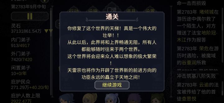 正常玩了3次以后突然想到的,如何最简易挂机玩法,由于一周目功德3点,正常飞升太慢要2000年以上。所以想到个另类玩法,大家交流一下。一周目正常玩到100功德,然后直接转生,掌门选变异天,特质气运之子,无垢灵体,身负龙气(避免前期突破失败死亡。)然后不用装备招徒弟,也不建任何建筑,也不打怪,死亡率为0,前期掌门死不了,气运又能带来装备,突破,和蛋,后期更死不了,中间看看有人要当弟子也可以无限收徒不