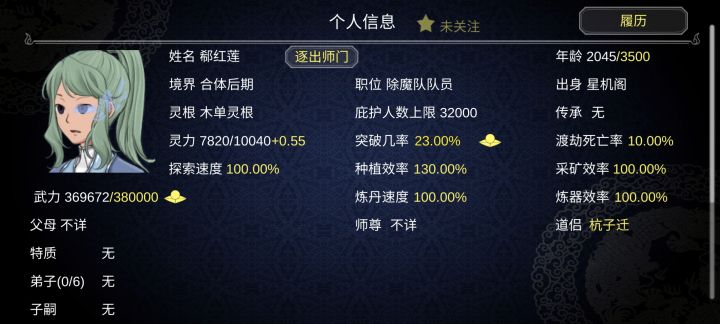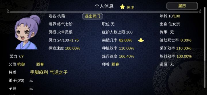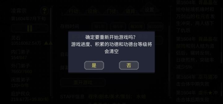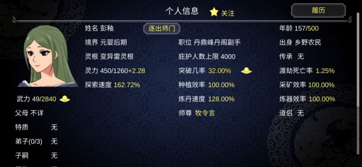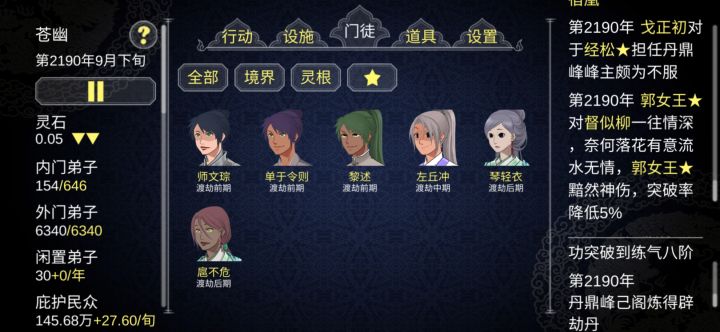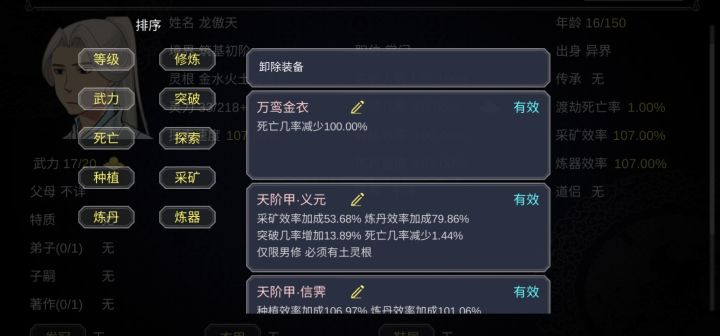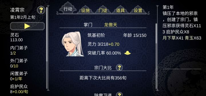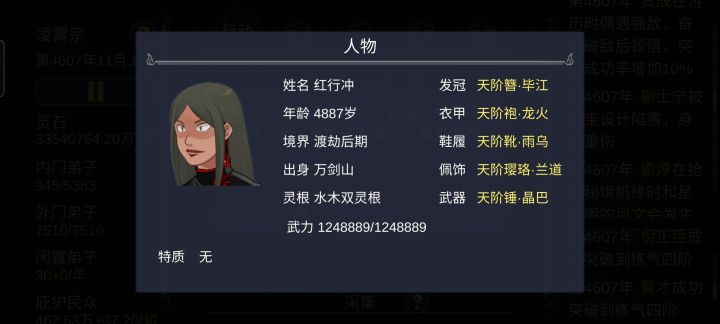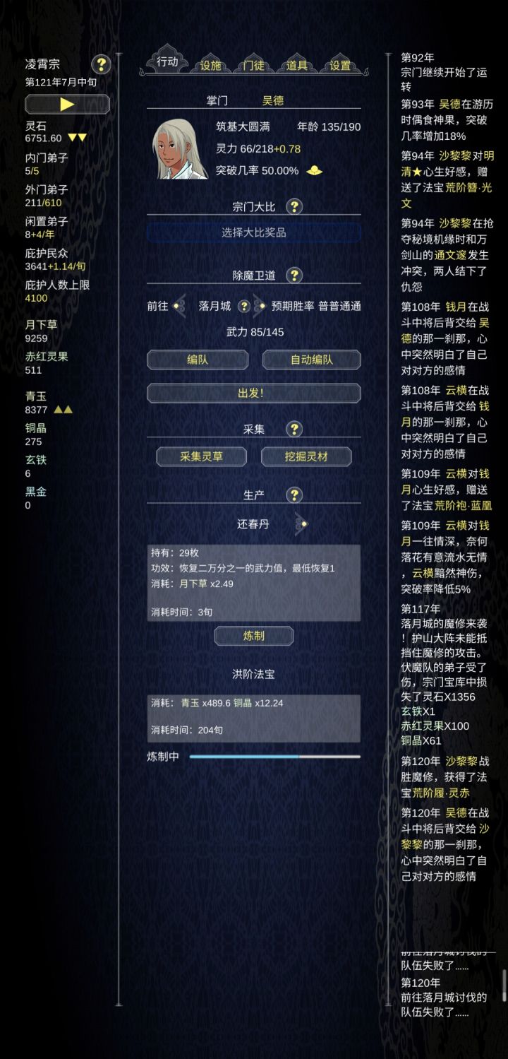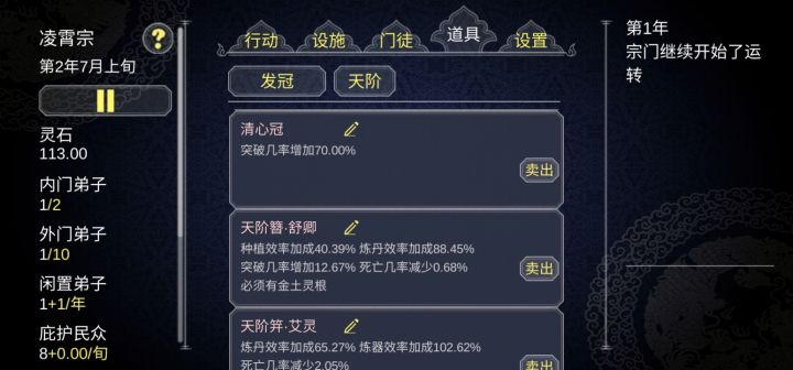 个人虽然还在玩第二周目,其实第一周目78功德就玩不下去了,不得不重开。自以为找到了真正的玩法。开局我选择了杂灵根掌门开局,杂灵根可以觉醒血脉变成变异灵根。前期内门人手不够我们需要大量的人手,内门人手也跟人物境界有关。我们需要法宝钓更高品质的徒弟以及法宝,比赛奖品能钓到更高一级的法宝。通过sl一路钓到地阶法宝(只能钓到地阶,天阶需要用天阶钓)流程:开局将慌阶法宝打造出来我们用这个钓更好品质的
