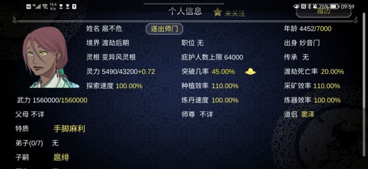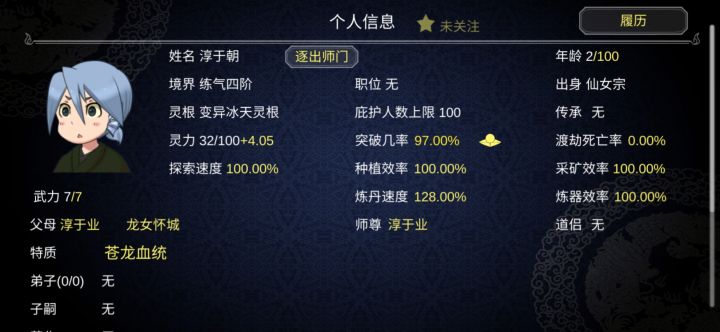 家族玩法达成,颜值平均水平中上,黑皮率不到5%,白毛大军实在是太养眼了,我儿子真帅呜呜呜。前前后后也玩了十几个轮回了,准备用家族冲天梯了,目前已经生到第四代了,直系后代有三十个╰(*´︶`*)╯留了几个外来的好看夫妻,给我的崽们生点老婆老公。 爹妈镇楼,为了保证基础颜值,初代我走的师徒除魔线,会掉点突破率,别怕,等一会就会结婚了。接下来呢就是等生孩子,这个看运气,我这个档算是比较能生的,一共