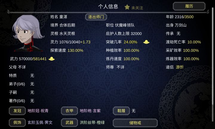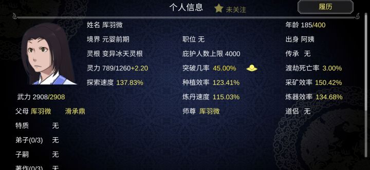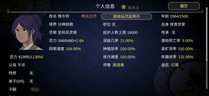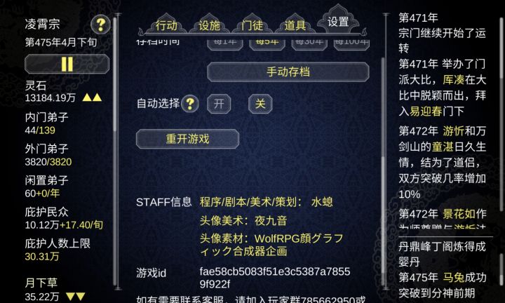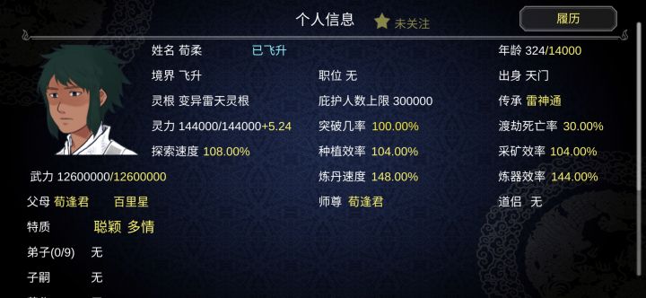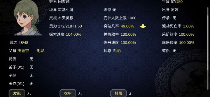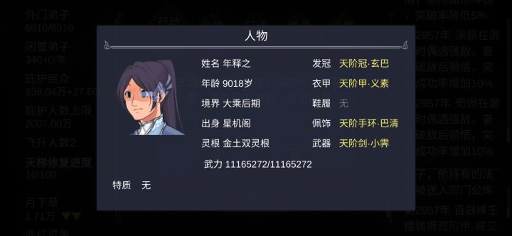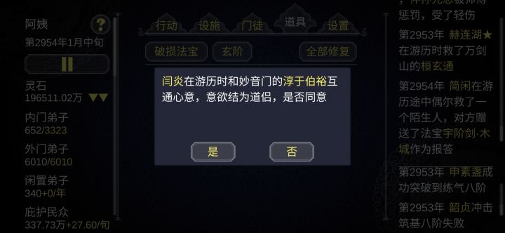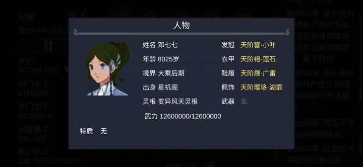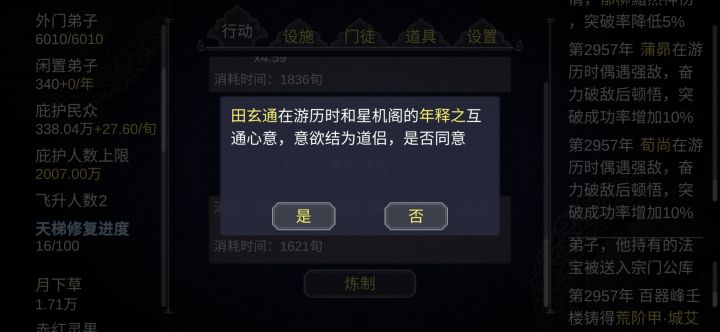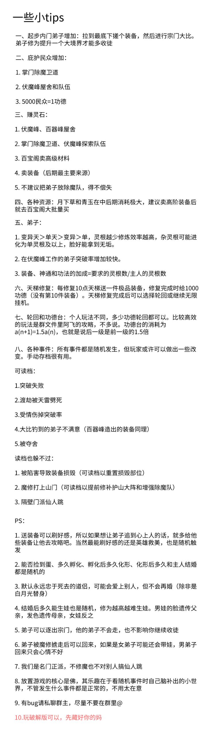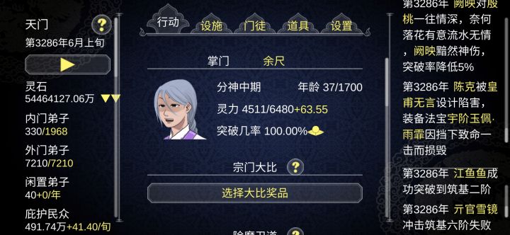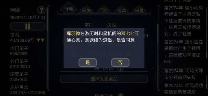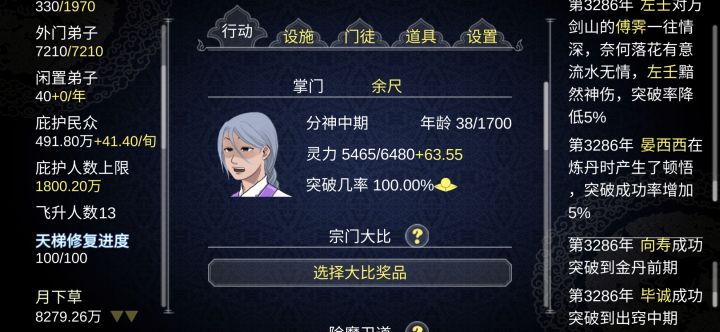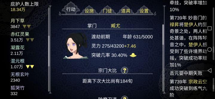 看到之前的努力没有白费,很激动(也是第一次写游戏攻略,有不足之处还请海涵)。这一期我们聊一聊宗门右上栏的内容,随机事件(奇遇)以及传承游戏的右边分为两栏,上面是宗门的大事件,下面就是一些琐事。琐事栏主要描述丹药炼成,资源的获得,弟子的突破情况,传承等情况,不是很重要,刷的很快,也不会怎么留意。这里面唯一需要注意的是突破情况,如果是功利的玩游戏,想快速通关的情况下,把重点弟子星标,关注他的每一
