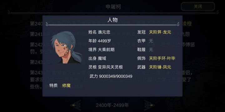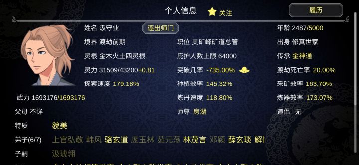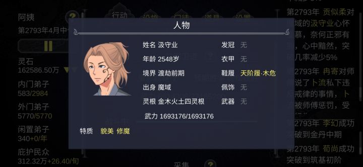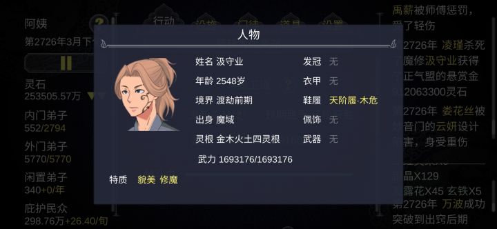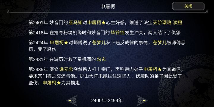 一周目遇到问题1.请婚界面可以踢人,踢了还可以结婚2.后期动辄三四百号人的宗门,信息过快,降低游戏速度又太拖沓3.装备系统繁琐,40页挨个整理舒适难受,不整理更难受4.角色关注部分界面看不到,事件栏显示不明显。