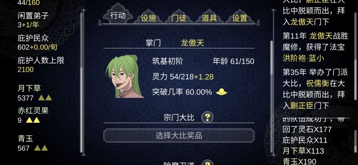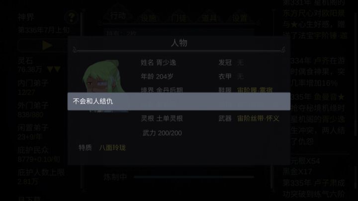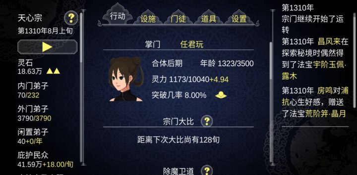 附上我的美女弟子玩了三周目,感觉修复天梯后就没什么乐趣了特别是弟子越来越多了。后期人数我保持在四五百左右,完全管不过来。我是手动党,只有刷伏魔副本攒资源、增加庇护人数时用连点器挂机刷。1.不好管理,不停的有弟子飞升然后岗位空缺,要上下滑找空位安排合适弟子上岗。2.作为一个关爱弟子的好掌门。在普通速度下,右边的通知栏完全看不过来,被迫不过问门派之事,只能偶尔看看有没有龙凤之主出现。然后想办
