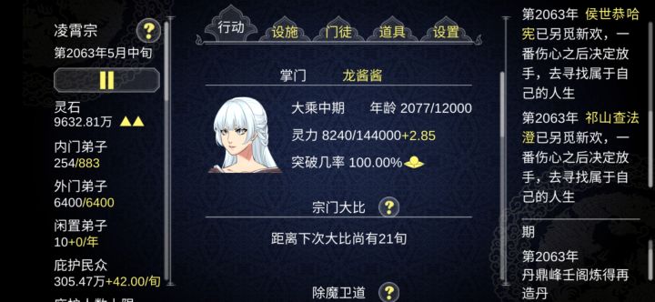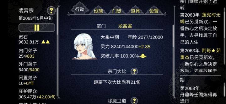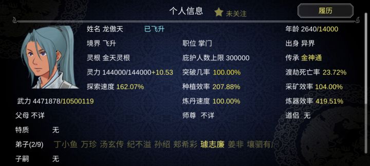 还好,除了第一周目比较不太行,很简单,炼丹,所有的装备只有突破,武力百分比和炼丹有用还有,在拥有大量的高战力弟子的时候的探索效率去打伏魔峰,前期就是钓弟子,钓装备,第二周目天命之子就不需要那么麻烦,炼器采矿都是不用开的,主峰和伏魔放人就行,疯狂炼丹,第一周目,丹药只给火天火单和炼丹神通的单灵根,先把他们喂到元婴,暂时不用管,其他人爱死死,反正没有弟子装备回收,没钱咱们就扒装备,地级卖钱,炼丹主要的就是缺材料,第二周目的一个天命之子加天生剑骨,可以带起一个宗门,一周目只能用貌美之类的来了,而且好像得放到伏魔峰,因为有几个有貌美特质的,我放在丹鼎峰,人都练死了,居然还没有人来送礼物,尽量说拜师的时候注意一下,不要管什么灵根属性,送同性师徒,尽量不要让他们结婚,生孩子生的太快,而且到了后面,其实是咱们是要刷出好看的弟子,甚至可以千年的大宗门,只有我一个人就为了等我的龙宝宝,很早之前玩过,我居然等了3000年,我人麻了