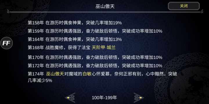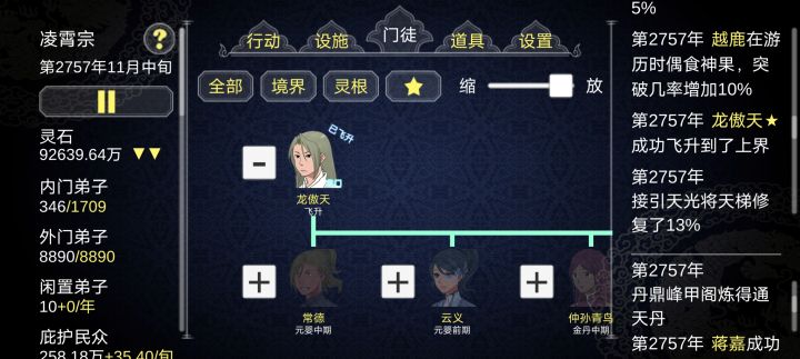 四周目玩家发出了好慢的声音操作的点太少了希望能加一个事件记录筛选,这样我就可以知道谁捡到蛋了,谁有神通了(想生混血宝宝好不容易发现了个龙凤之主还去已经结婚了 很气)弟子页希望多一个资质筛选,生着生着生出个气运之子我都不知道