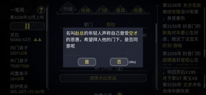 玩了几个小时了,宗门也快建立120多年了,但一直没看到有设置里的弹窗选择选项出现。(还有社区里玩家说的结婚选项等等选择都没看到),觉得很奇怪,就仔细盯了盯游戏画面半小时。发现弹窗是会有突然闪现一下又消失的情况。闪得太快以至于我之前都没发现…希望快点解决这个问题真的好影响游戏体验啊呜呜呜