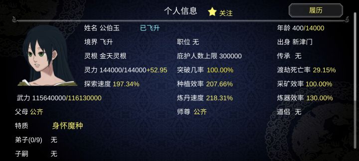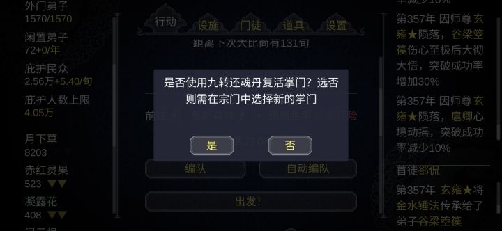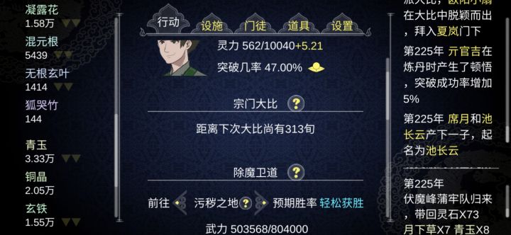 玩了好久了,超级有趣啊,到后期弟子太多管不过来啊,还有那些资源要一个一个点有点麻烦,要是能够统一就好了。话说要是能够控制自己角色(掌门)就好了,不然到后期就有点无聊,比如增加我与其他角色的一点互动,能够自己去增加别人好感,选择自己要不要子嗣,如果不要也可以让收养养子什么的