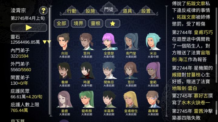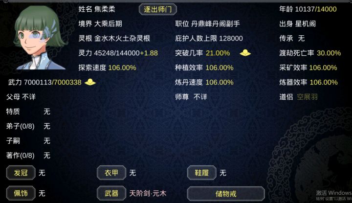 首先是行动栏位,掌门的作用太过单一,后期几乎无事可干,白瞎了一个弟子,建议可以在行动栏位增加功能:1、增加门派风格选择:对应每一个主峰的功能,掌门可以选择门派风格为:除魔、挖煤、拔草、炼丹、制杖、均衡,除了均衡外的其他风格可以按照掌门的相对应属性*1.5掌门加成*掌门境界加成(从筑基开始1.1然后每一个境界加0.1)的额外加成给每种风格对应的行动。举例来说,一个200%探索的筑基掌门选了除魔风