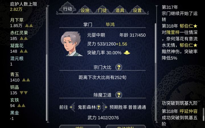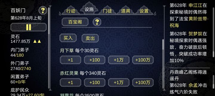 1.增加背包检索功能。希望法宝也和丹药一样有明显提示当前库存。目前没有一个好的渠道看到门派的法宝库存2.精确检索门徒的优势属性,把门徒的探索,炼丹,炼器,采矿,种植等生产属性做一个比较明确的排名。弟子一多,各个设施之间就不好调配3。增加一个闭关跳过的功能。.后期等待时间太长了,资源获取。修为提升去太慢。可以限制闭关次数总而言之,如果不做改变,大部分玩家游戏根本玩不到第三个周目