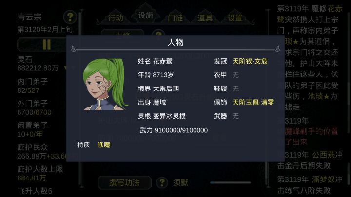 被魔修入侵,却没有抵御手段魔修属性魔修武力910万 VS 防御700万、掌门武力1550万+4700万队员宗门法阵最高只能16级,只有700万防御(有问题)结果是:1440万武力的大乘期圆满弟子,被910万的魔修轻松破门掳走结尾惯例,附上通关图以及,杂灵根无特质,一周目,蜕变后的掌门