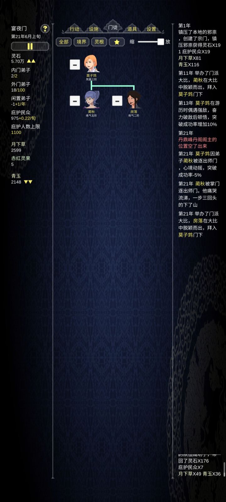 游戏是好游戏,熬夜玩特别上头。(就是那个道具栏标签能不能设计成一排的啊,谁能 想到我开了六把才发现原来那个丹药键一点可以展开啊)有时候玩真的有种转世的感觉,让我给你们细细讲来。前几把就不说了,完全没上手,开局一个劲往落月城跑,光速打开下一把(。我认真玩第一把玩招了第一个徒弟,是个妹子,名叫蔺秋,杂灵根,修炼特别慢,当时我也不知道杂灵根有个可以去伏魔峰探险突变,又急于收徒,于是我在第二次大比的