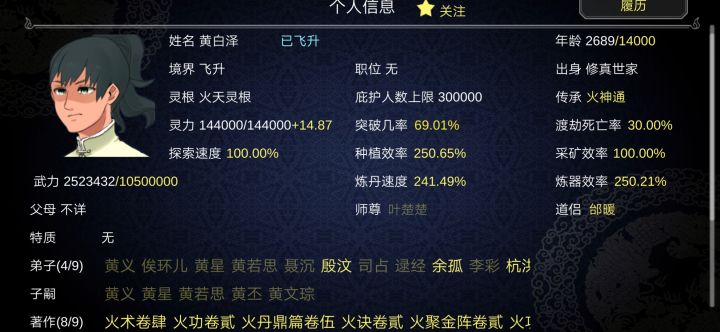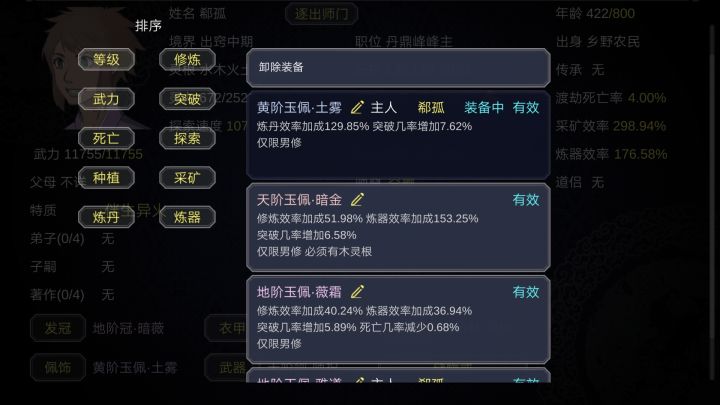 作者快出一键分配工作,一键分配装备吧,最好能重新设计一下背包系统,现在的太简陋了。不能直接看到所有没装备的法宝,只能按等阶来查看,这点也有点不方便。服用丹药的时候,能不能加一个一键吃满的功能,就不用一颗一颗的点了。还有就是查看门派所有人这个太不方便了,缩最小也看不完,我觉得没必要用树状图,改为一代弟子,二代弟子依次类推。弟子,丹药,法宝都可以这样子展示出来,玩家在手动设置条件来选择怎么展示。