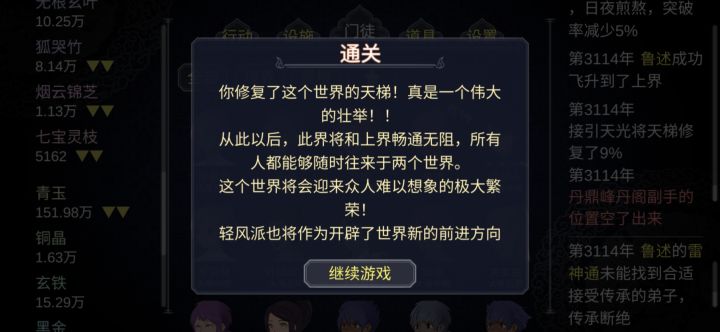 这样算通关了嘛,这游戏其他都好就是弟子多了眼和手酸,能来个一键上装备和一键修复装备就更好了。玩法也可以在多点