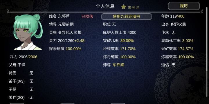 后期弟子多了真的没法喂。仓库丹药成堆,但是一堆弟子突破失败,根本喂不过来。希望可以出个低于多少%突破率就自己吃丹药。可以设置弟子优先级,可以优先喂想培养的。然后可以给弟子设置想发展的方向,比如种植的,就会自动优先穿带种植词缀的装备。不然几十个弟子,几十个装备,真清不过来