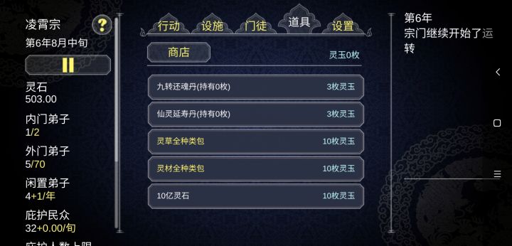 模拟游戏说到底要有一个合理的数值现在这个游戏的数值系统体验出来,与其说叫门派模拟器,不如说是掌门模拟器外门弟子和内门弟子的资源获得增长完全跟不上炼宝、炼丹每一级四五倍的增长,举个例子,我炼个黄级法宝要几万青玉,光靠弟子挖青玉那得挖一百年然后掌门出门历练一趟就是千多青玉这合理吗?啊?这合理吗我手指都点断了经营出来的门派,到了中期就会变得几乎完全无用,他们唯一能对门派做出的贡献就是长的好看一