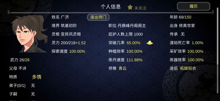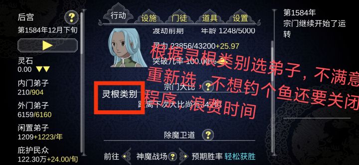 根据类别选弟子,不满意重新选?方便钓鱼度过前期。显示性别不想师生恋掉突破率显示弟子数,不掉传承显示神通类别,例如突破率优先传承增加神通类别,例如突破率优先分配修炼速度炼丹分配炼丹,炼器分配炼器最好弟子列表显示,一目了然增加搜索🔍类别,突破,炼丹,。。。和弟子装备排序综合一下装备排序增加显示其他弟子的装备,允许没收,修复,卖出。。。好装备竟然在别人的包包里,不能让它藏私房钱