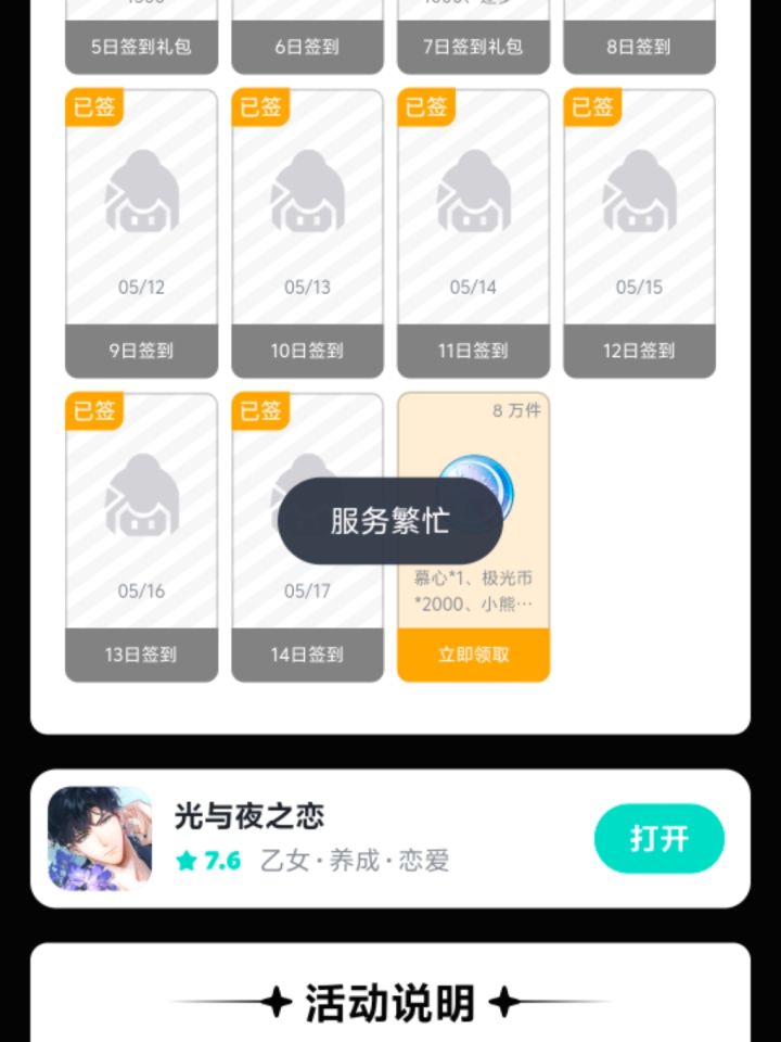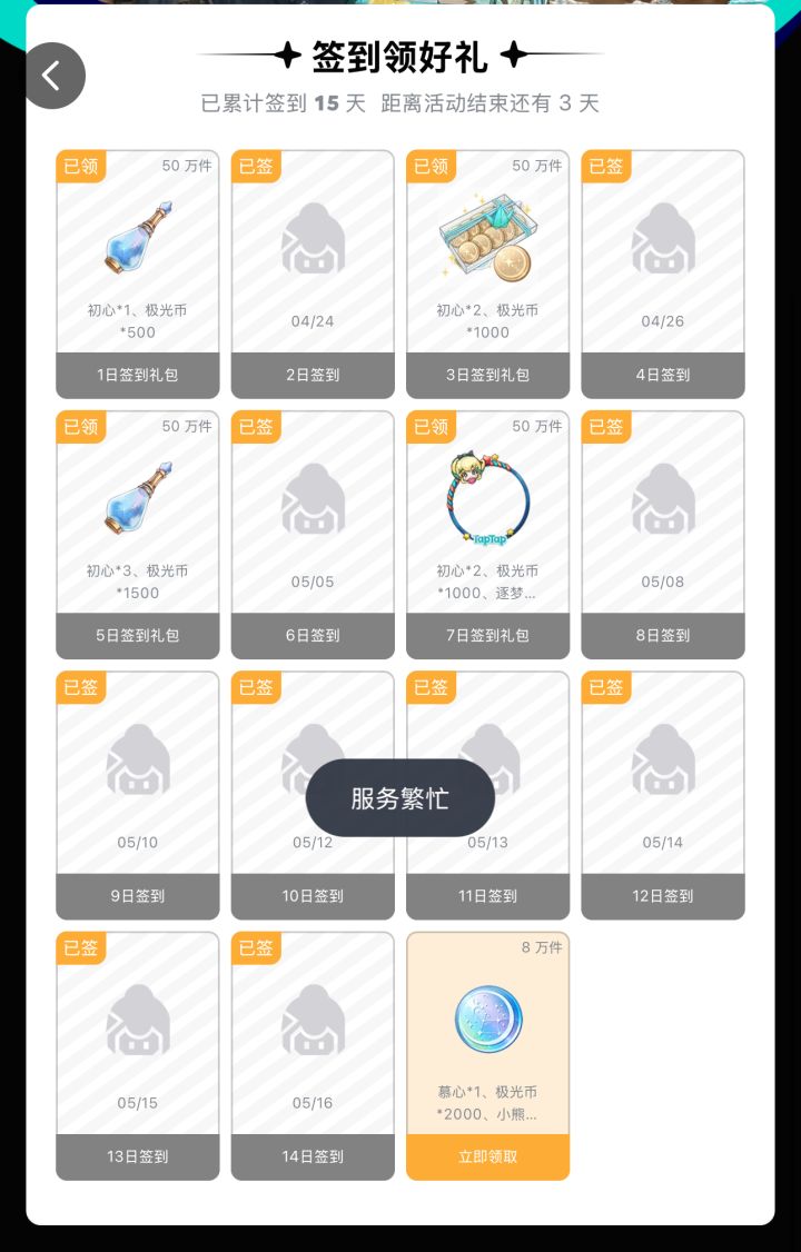 签到领取时,服务器繁忙!!- - - - - - - - - - - - - - - - - - - - -5月19号:可以领取啦~