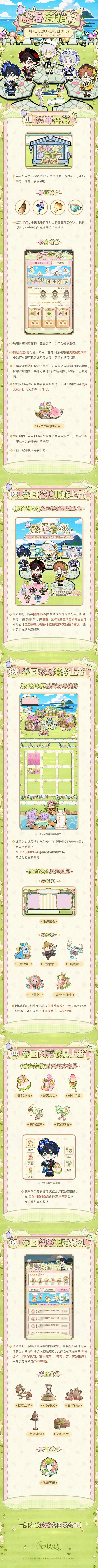 4月7日 05:00 - 5月7日 04:59期间,[丰果农场]将开启季节活动[暖春芳菲节]:▼ 芳菲开幕丰收忙碌季,神秘船来访~活动期间,丰果农场将开启限时活动,参与活动即可获得丰富奖励、解锁限时剧情。▼ 春日搭档服饰上新活动期间,购买[露华春衫]系列搭档服饰专属礼包,即可获得一套搭档服饰,并附赠一套对应男主的全新异色服饰,同时还可自选获得北极星/十连签收券/其他抽卡资源,还有更多农场产