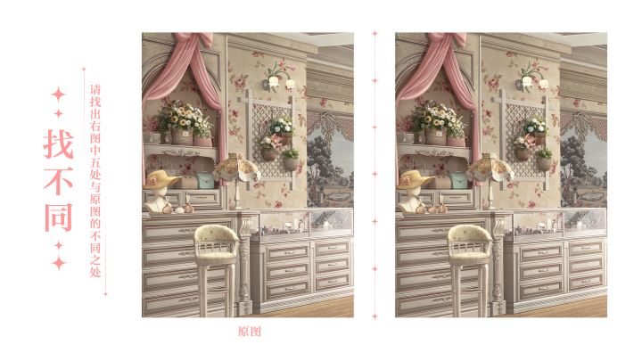 蓬云映照晴空,旧梦停泊,霜迹勾勒出时光的寂静。铃兰敲响埋藏在迷境的心匣,青藤带来旧忆的香息。粉幕馥芳前,似有什么是不一样的~透过时光镜影,来看看有什么不同吧!【参与方式】本期找不同活动共有五处不同。请设计师们在右图中圈出与原图的不同之处,并带图发送答案。【福利时间】感谢大家参与有奖互动,蓝星会从所有正确评论中抽出5位幸运设计师获得【夏鸣星正比徽章】*1【活动时间】2025年10月