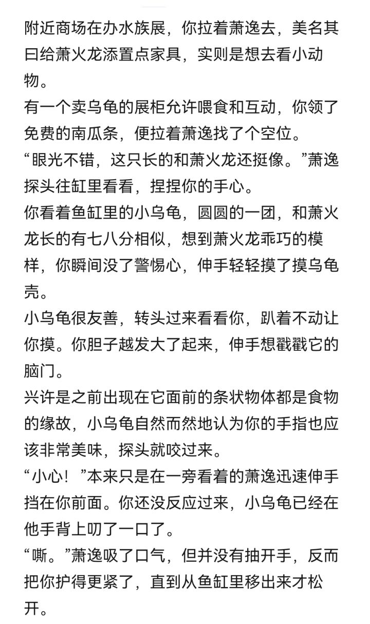 今早你还在赖床就收到了安安的消息。“我有一个惊天大发现,急需你这种有男朋友的配合测试。该信息不支持回任何内容退订。”“参加(我是自愿的)”不知道安安葫芦里卖什么药,你决定先回复。“好的,你需完成的任务如下:请在男友进门时朝他跑去并张开双臂要抱抱,观察他的反应并如实汇报。”“收到,保证完成任务”你快速回复,发完才发现这话怎么这么萧逸,一定是最近学他说话学的。放下手机,你转头看向浴室,萧逸刚