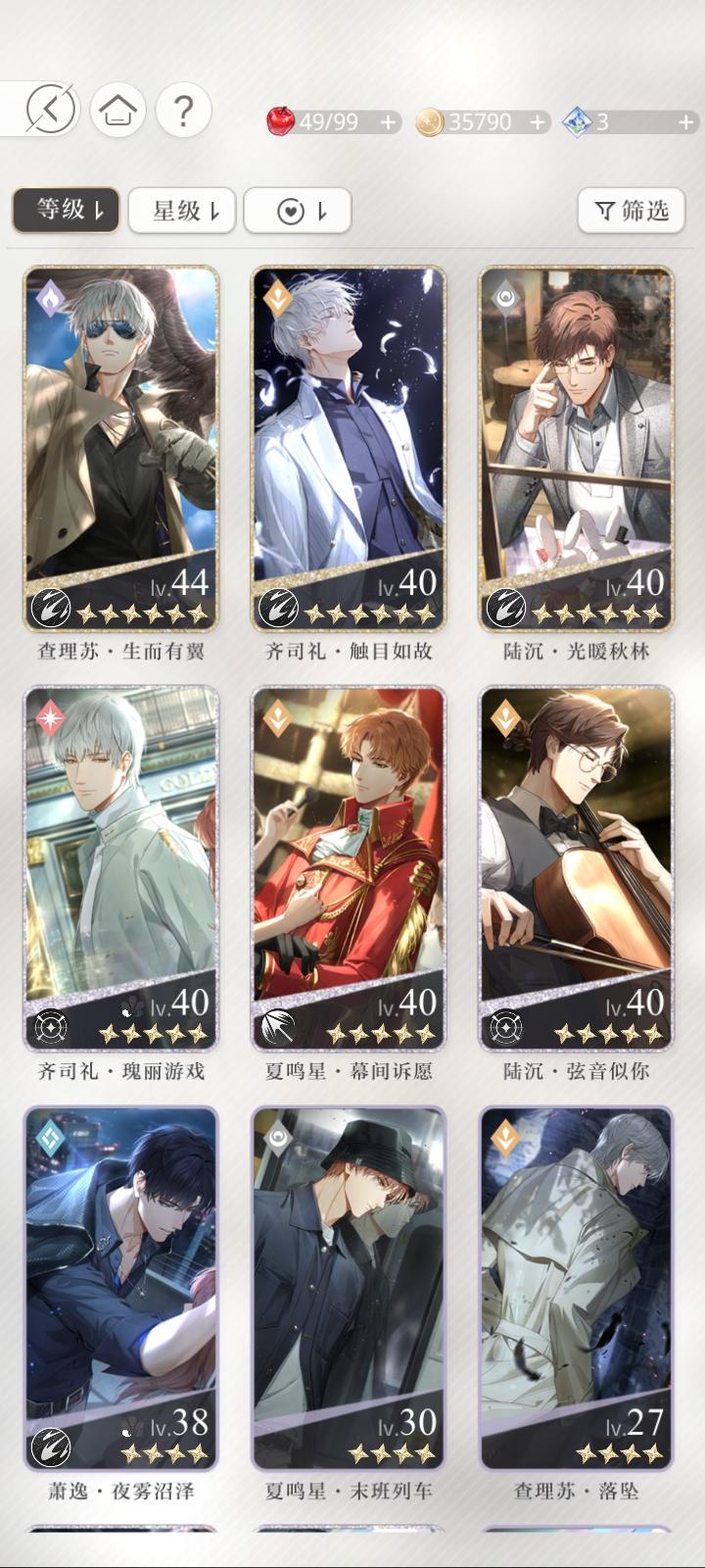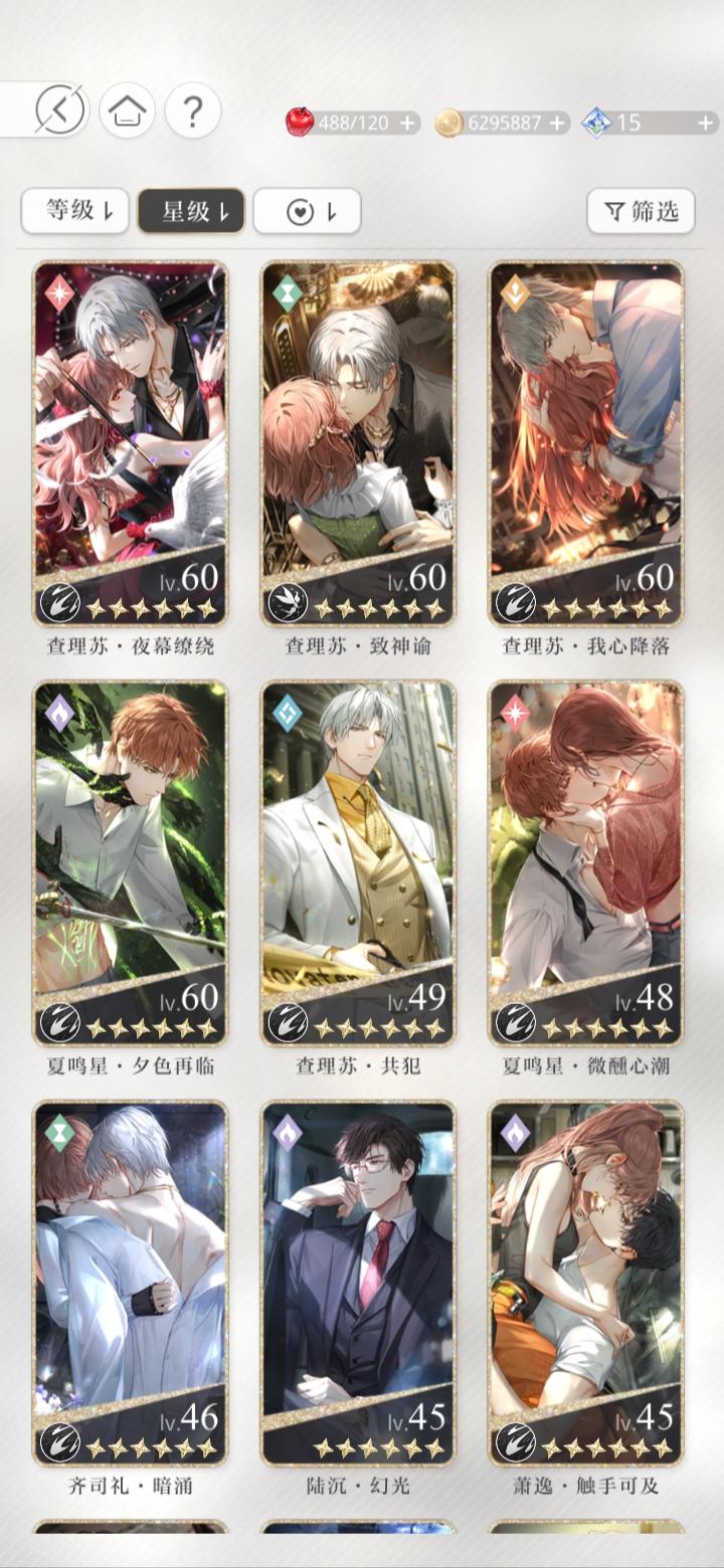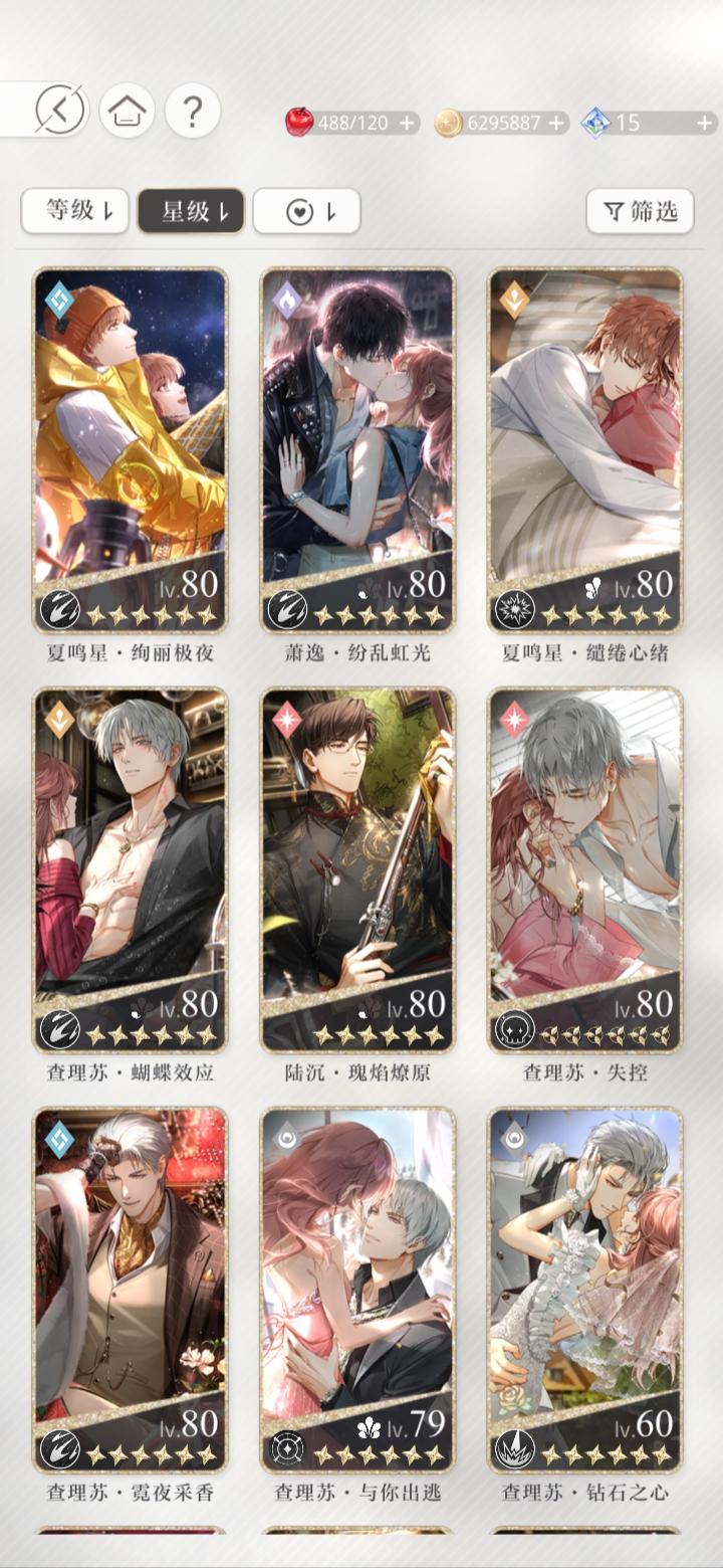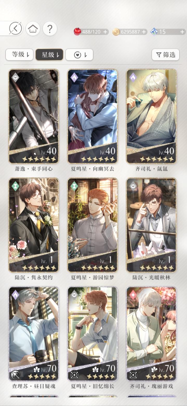 宝贝们,我问一下这三张卡我应该先养哪个。查理苏的开了一花,但是同属性的我有一张六星卡。萧逸的这张同属性的我没有其他的了。齐司礼的也有六星卡。