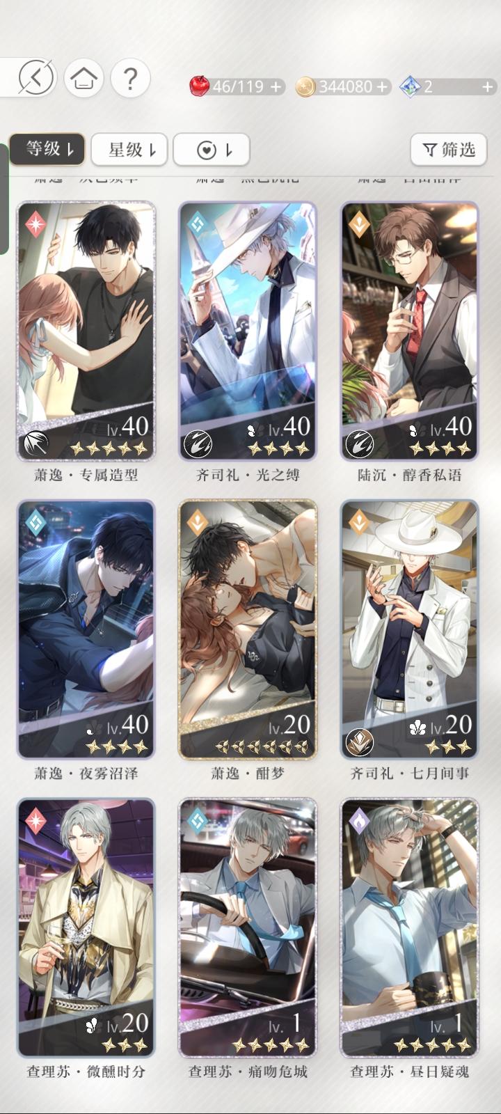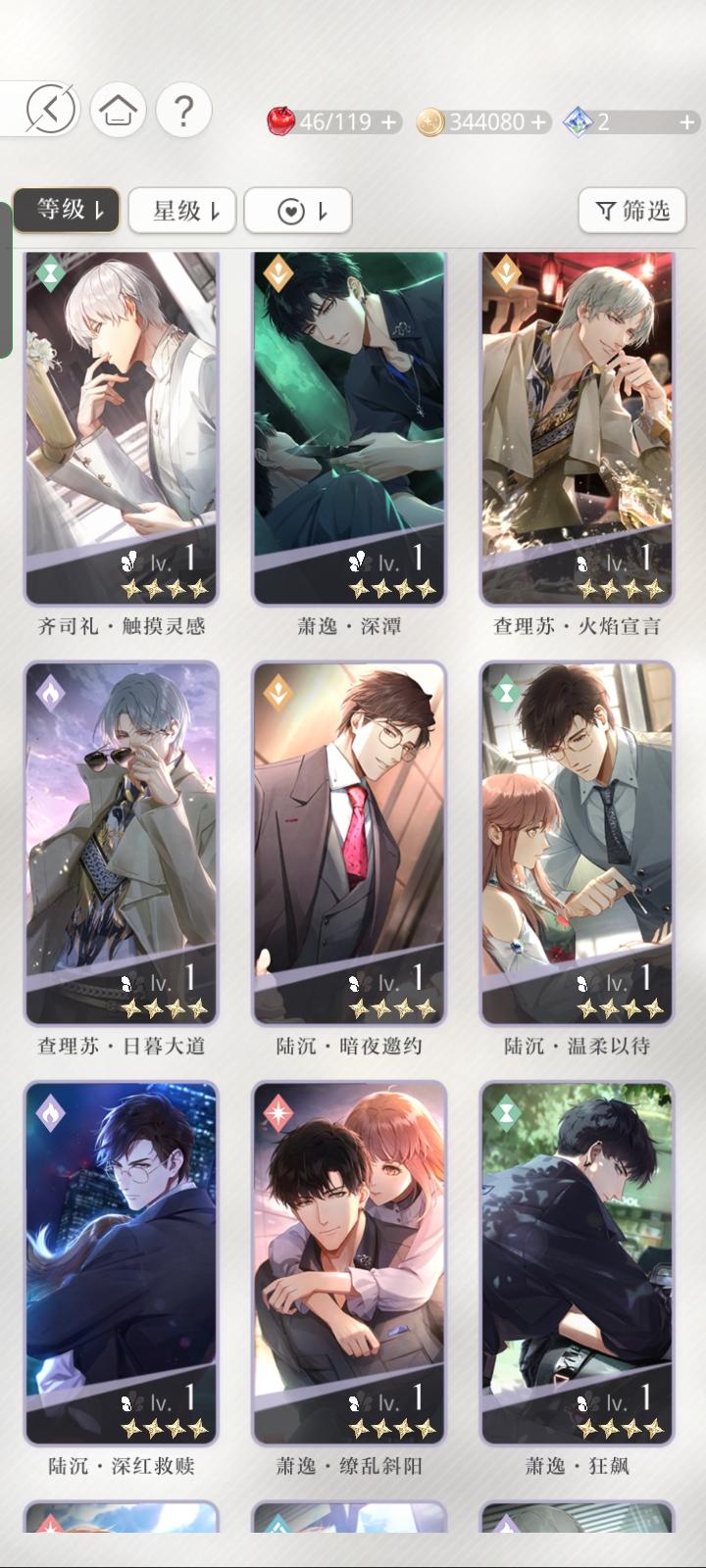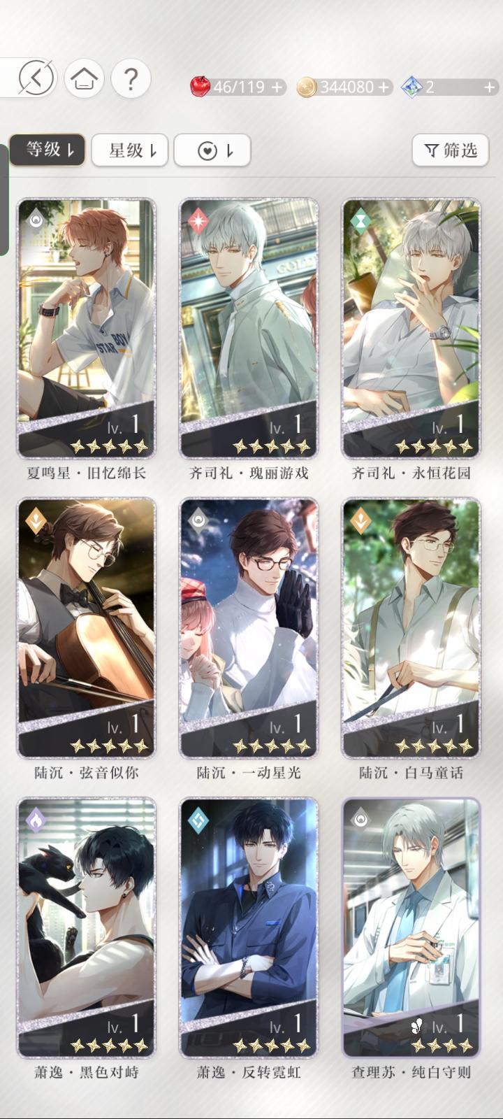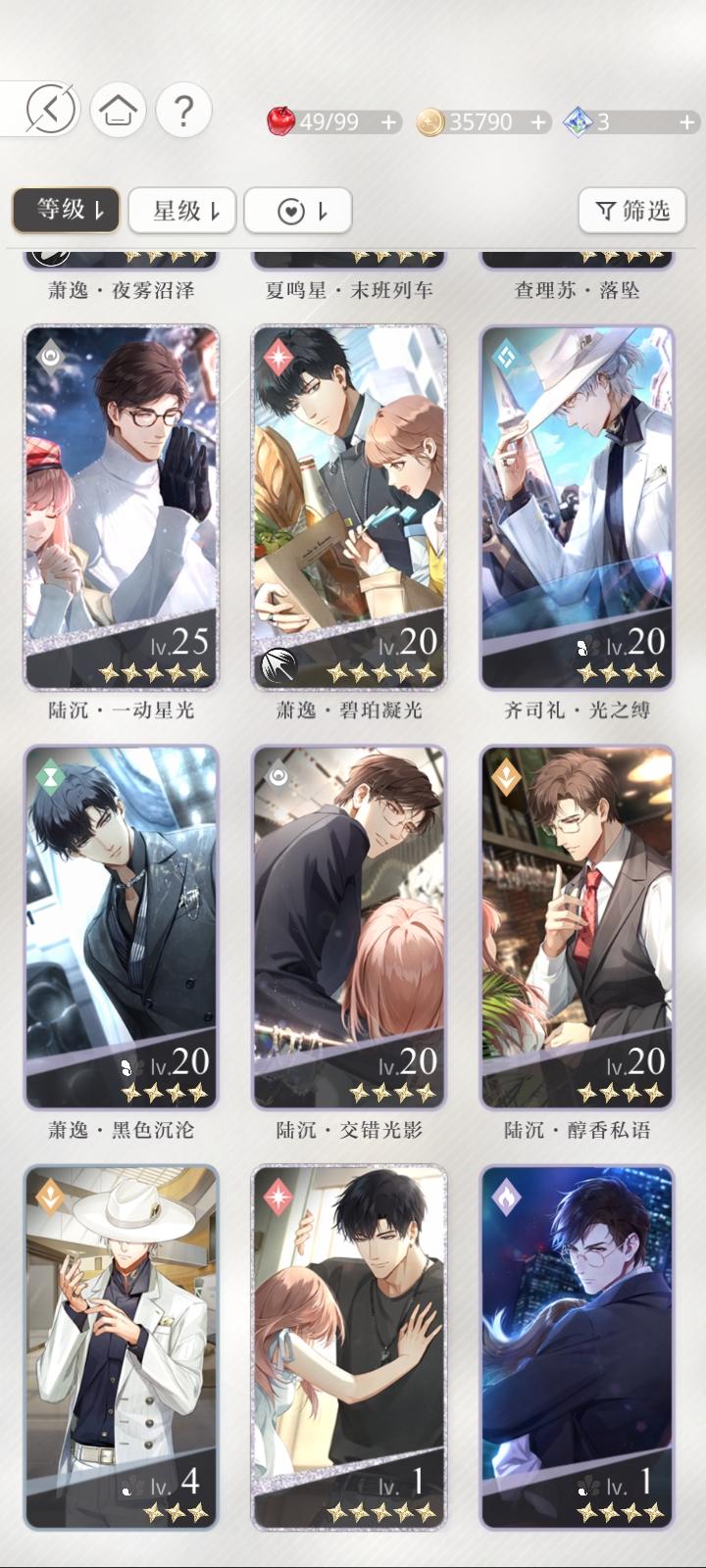 宝贝们,我问一下这三张卡我应该先养哪个。查理苏的开了一花,但是同属性的我有一张六星卡。萧逸的这张同属性的我没有其他的了。齐司礼的也有六星卡。