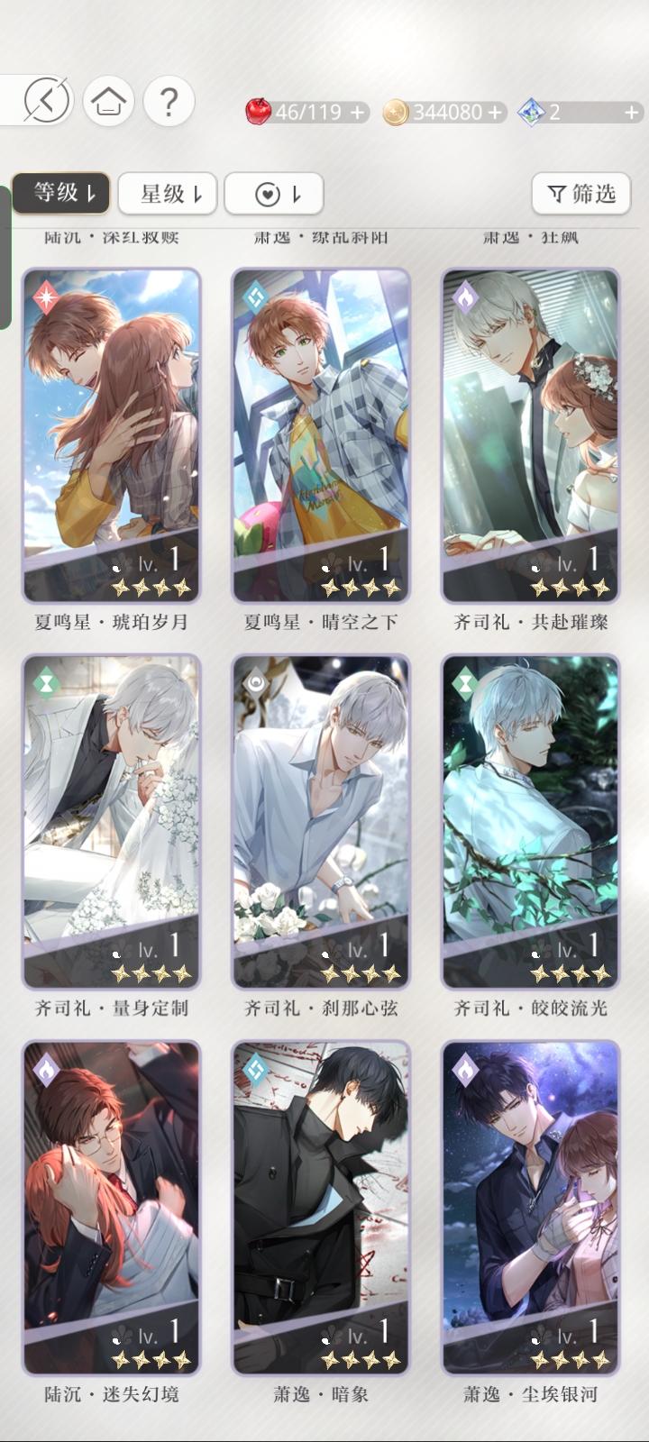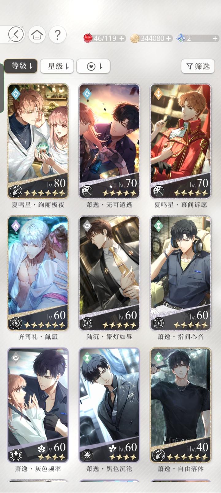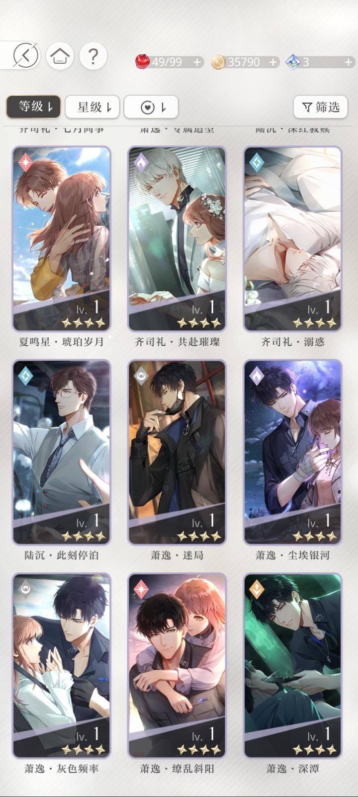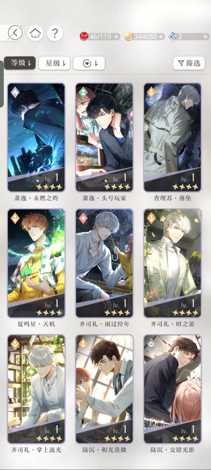宝贝们,我问一下这三张卡我应该先养哪个。查理苏的开了一花,但是同属性的我有一张六星卡。萧逸的这张同属性的我没有其他的了。齐司礼的也有六星卡。