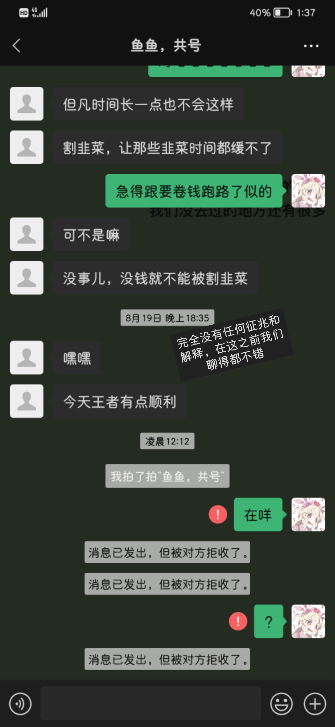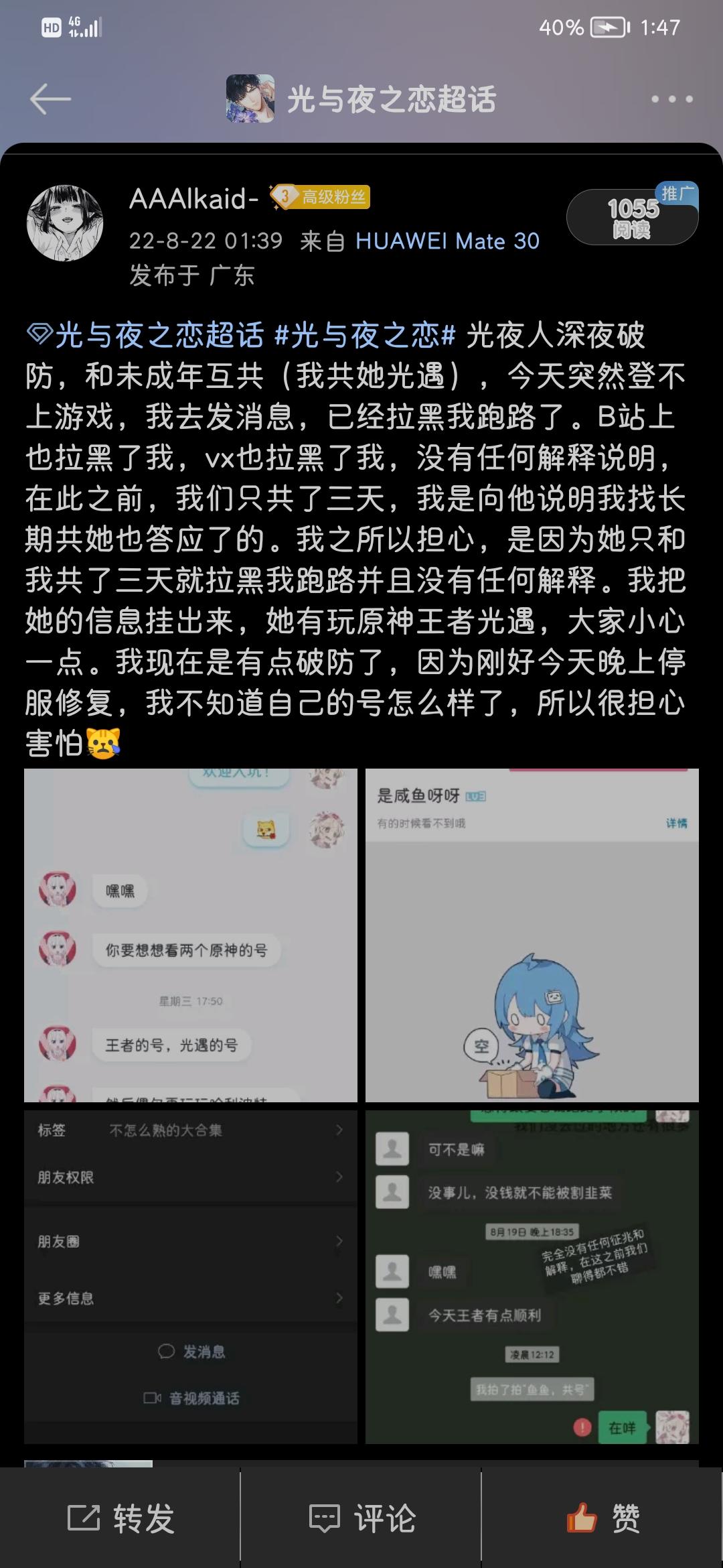 光夜人深夜破防,和未成年互共(我共她光遇),今天突然登不上游戏,我去发消息,已经拉黑我跑路了。B站上也拉黑了我,vx也拉黑了我,没有任何解释说明,在此之前,我们只共了三天,我是向他说明我找长期共她也答应了的。我之所以担心,是因为她只和我共了三天就拉黑我跑路并且没有任何解释。我把她的信息挂出来,她有玩原神王者光遇,大家小心一点。我现在是有点破防了,因为刚好今天晚上停服修复,我不知道自己的号怎么样了,所以很担心害怕😿 下图为我在wb上发的帖子😿
