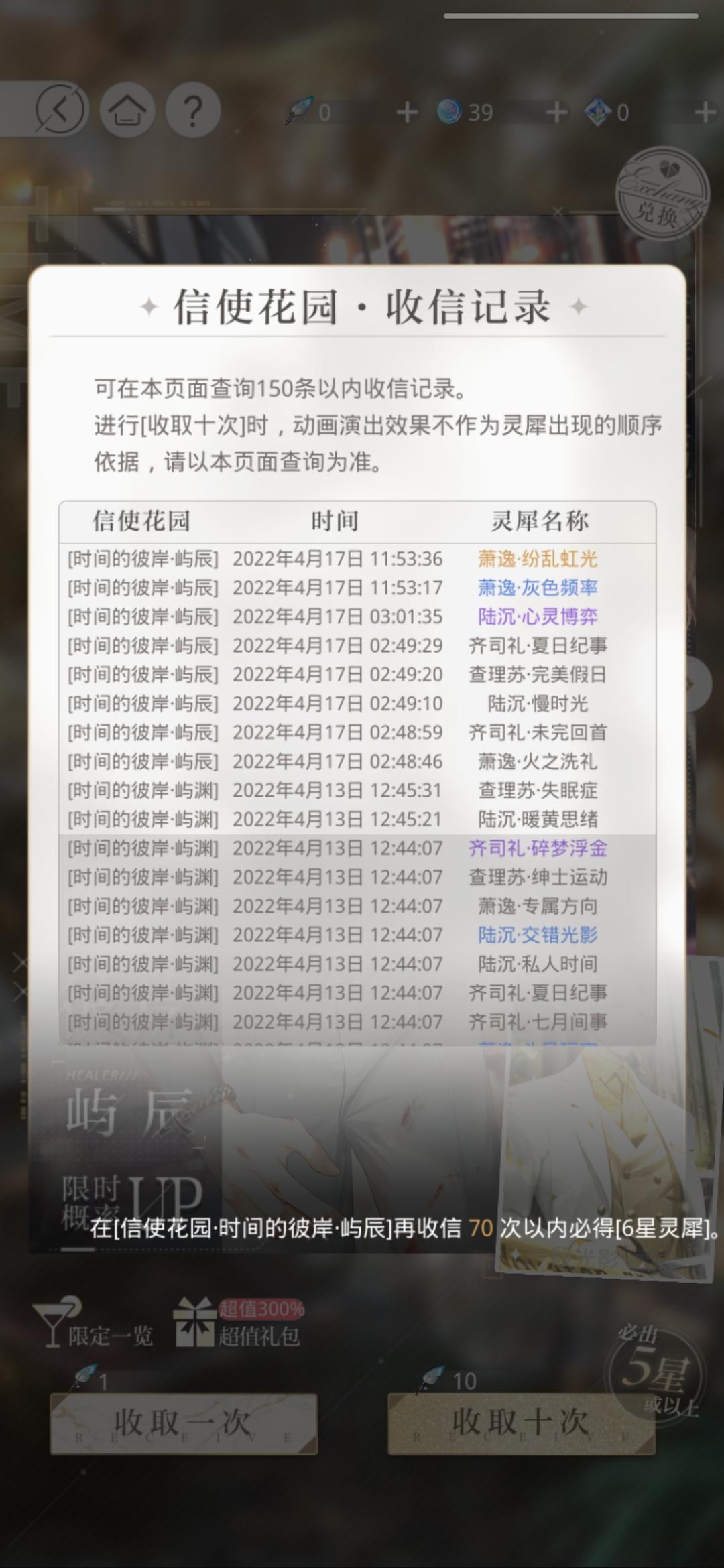 我是真的会谢,我刚开始从限定一览里看到四个活动灵犀,我以为陆沉和查理苏的只是图片没有出来而已,于是我弄完萧逸和齐司礼的我就又把小熊星座花完了去抽未婚夫的,结果抽了三十次都没抽到,我又以为是我倒霉,结果你说这个活动是分开的😐😑😓😔