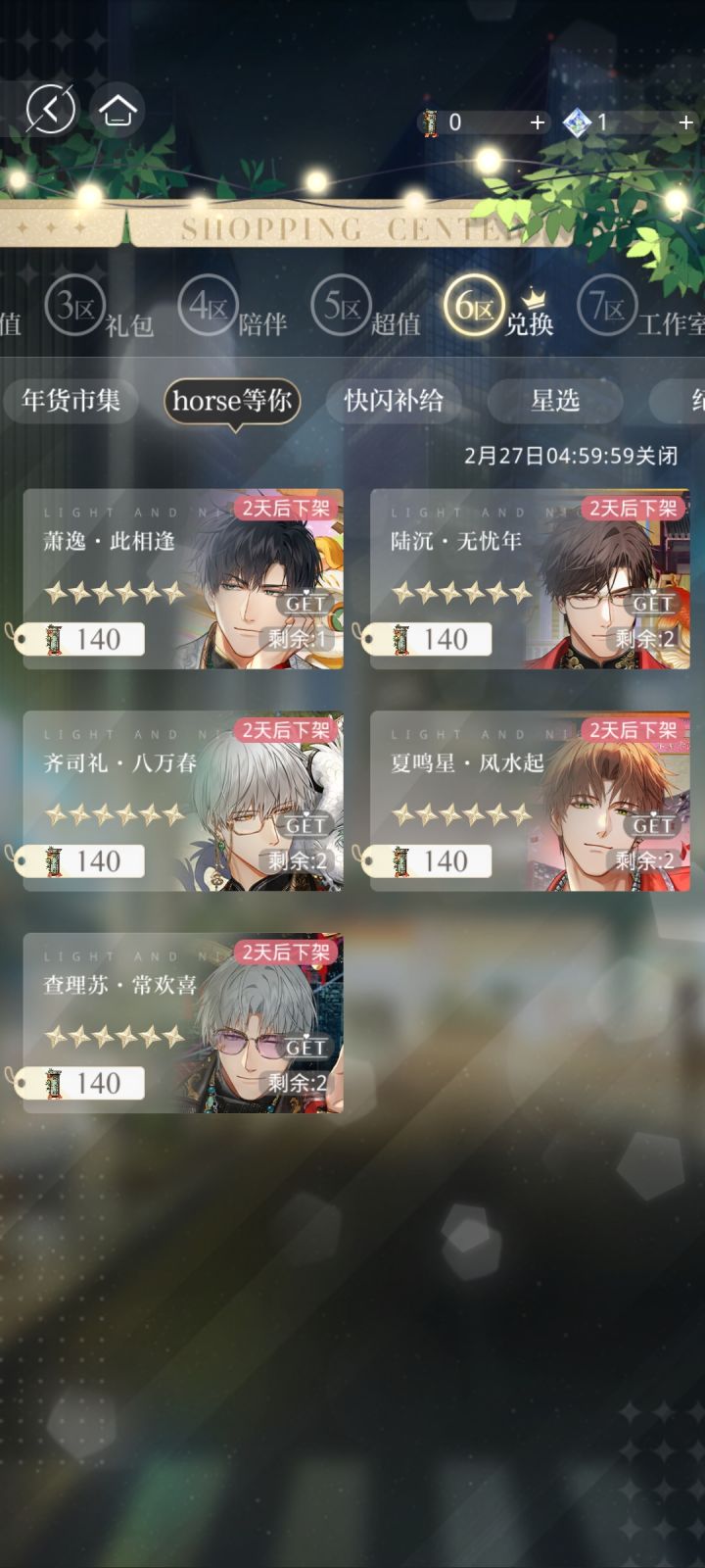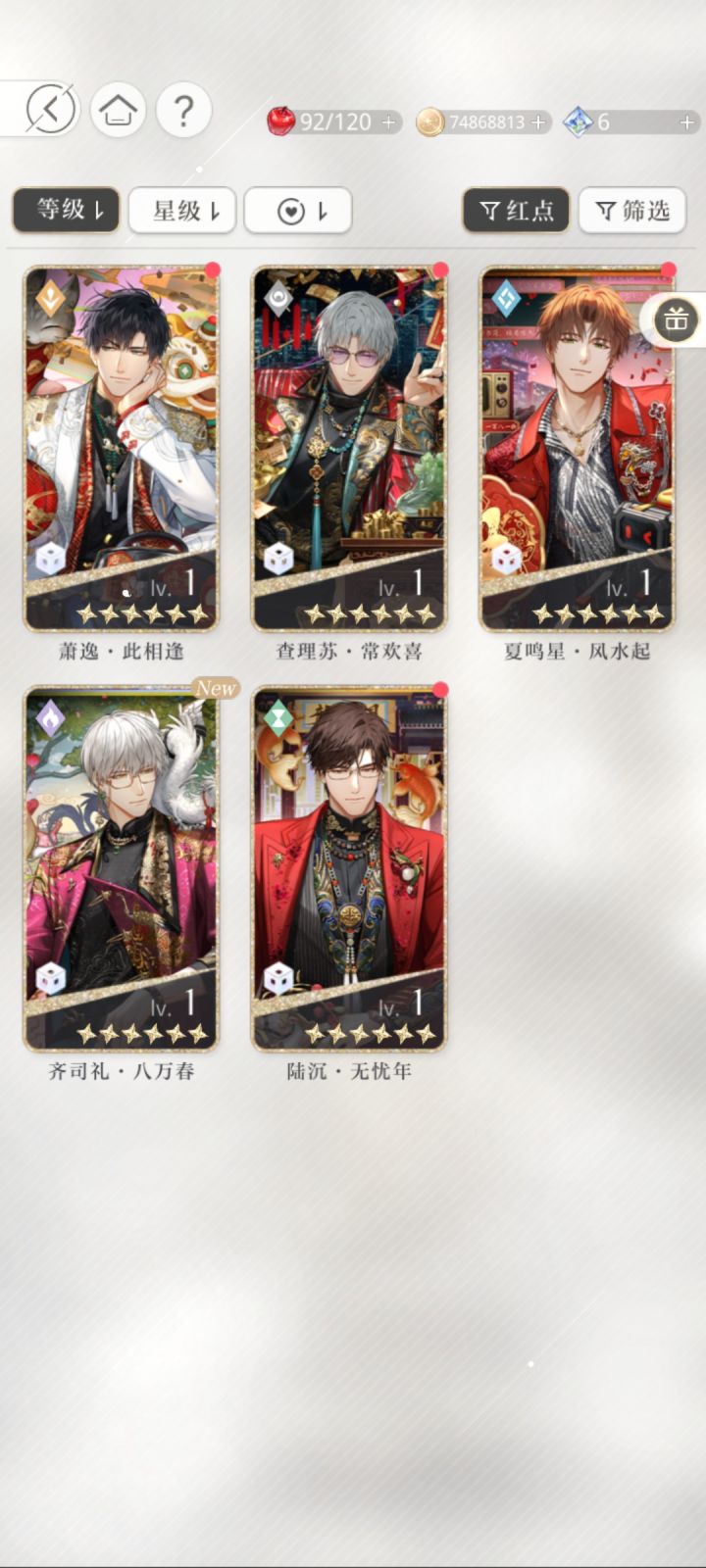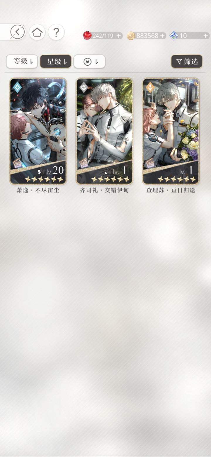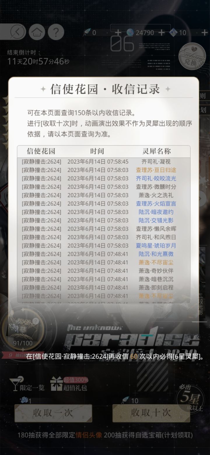 之前就拿到四张了,就差77没有,但是当时没资源了就没下,今天打开看发现还有几抽就可以换名片了,就单抽了,结果6抽出了两个金,有被震惊到,就是可惜名片又没有换到萧逸啊啊啊啊