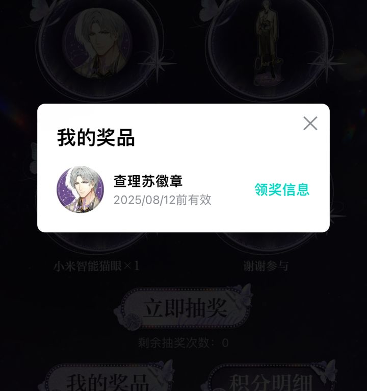 #光与夜之恋 查理苏 声明:以下所有链接和内容,都来自TAPTAP本站的游戏公司发布,符合《规则百科》,无任何外部链接和内容,请管理员核查。 领取方式:使用手机,点击下方链接。 活动时限:2025年7月20日—2025年8月2日 徽章:点击下载链接,完成任务获得积分,使用3积分兑换《光与夜之恋》查理苏生日限定头像框。 有效期120天。 活动链接:* https://www.tapt