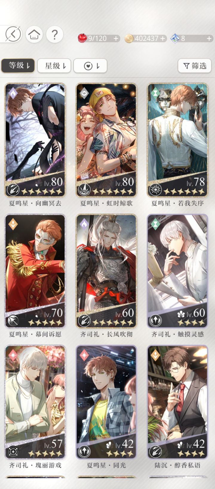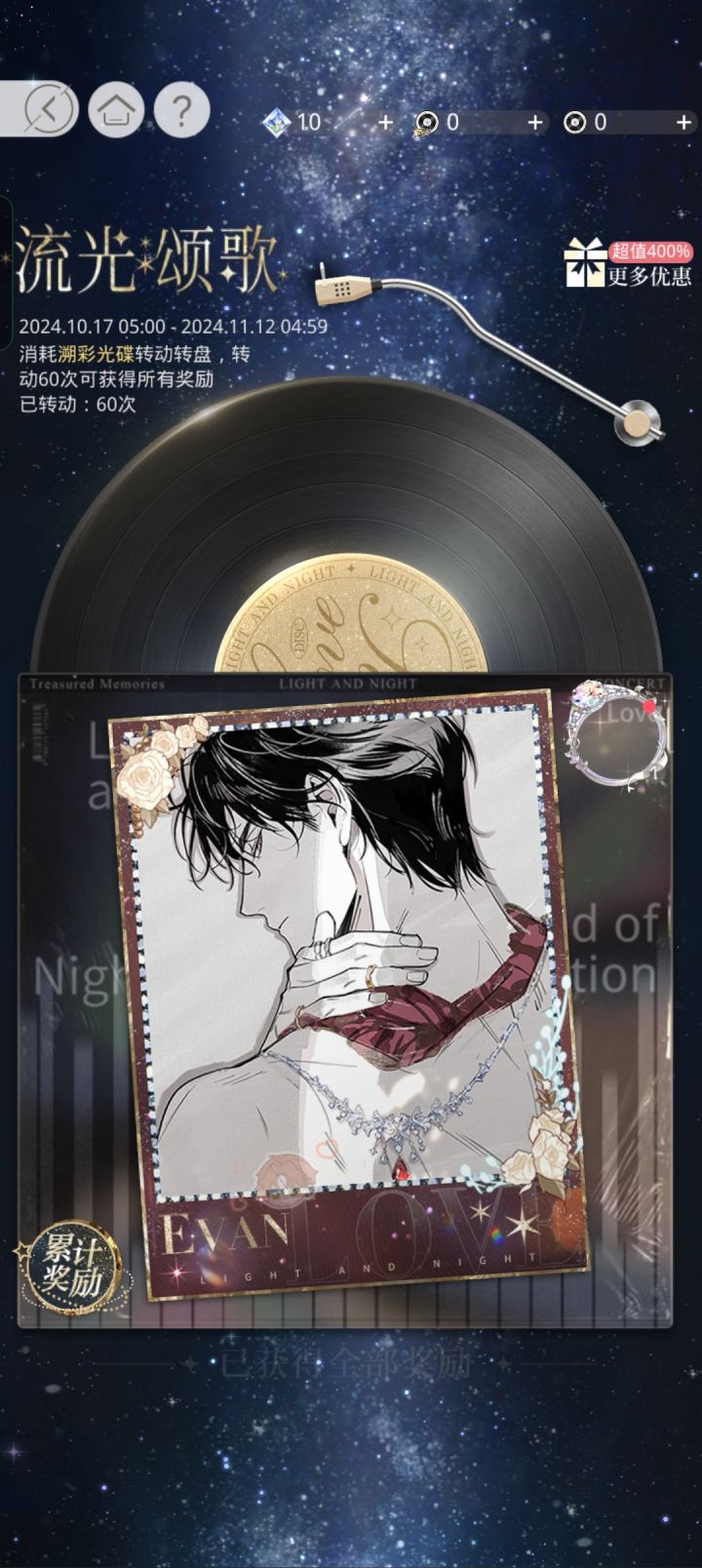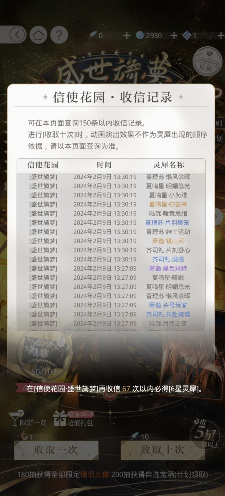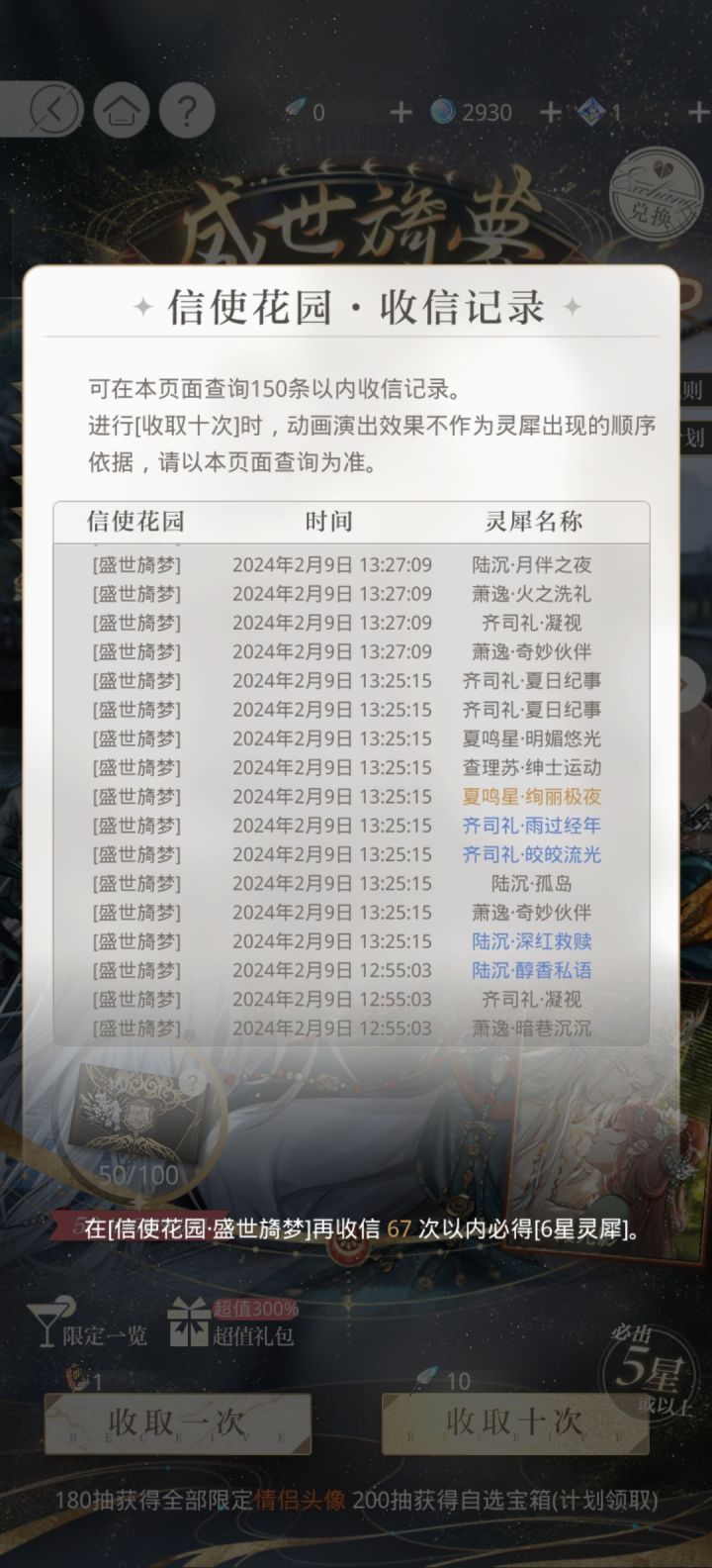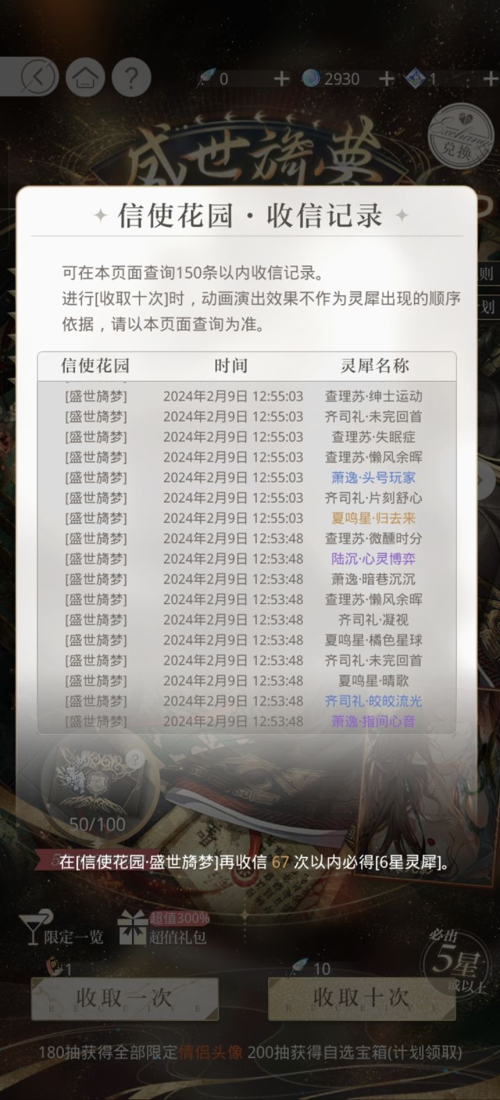 50抽,三张夏鸣星,一张萧逸,第一天果然容易出货!!#光与夜之恋#盛世旖梦
