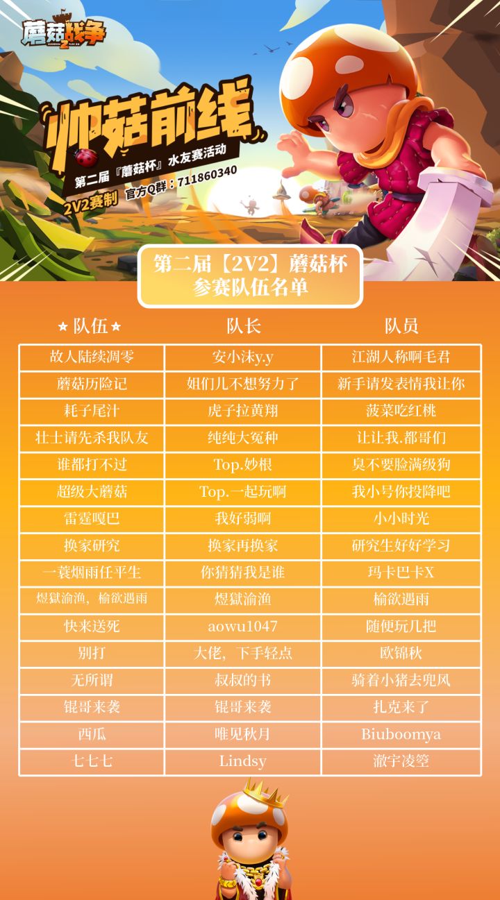 上次有的首领说1V1不是自己强项,2V2开黑爆兵才是自己的战场,所以大帅菇本次特地调整为2V2!这次2V2水友赛也希望大家能够享受乐趣,结交更多的朋友!找到自己的灵魂伴侣!以下就是这次成功报名的选手啦,我们的海选赛时间会在6月25日开始,选手们不要忘记上线对战哦~⚠️请以下入选选手,于6月25日中午12点前,添加 水友赛选手Q群:819914197添加时备注:小组名称-游戏名称 👉 例如: