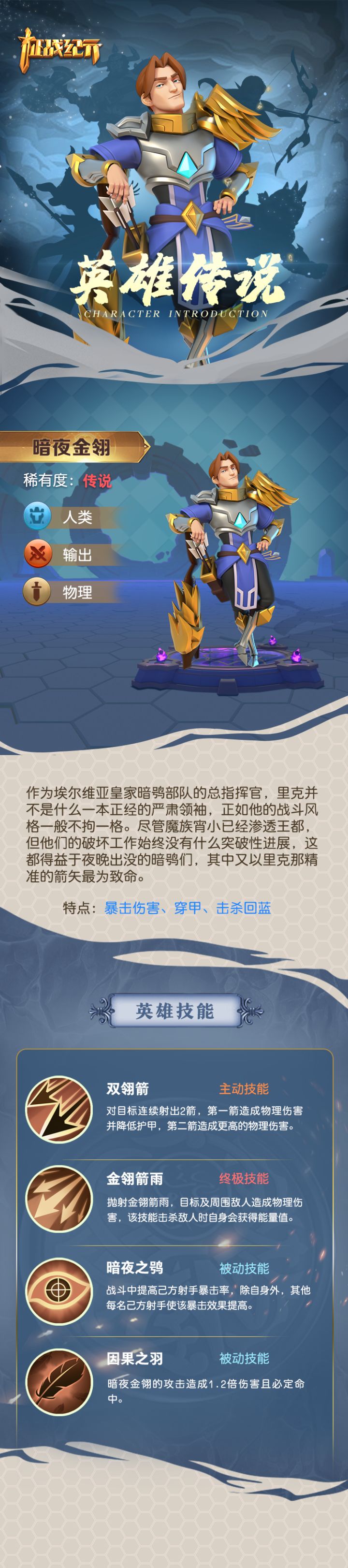 今日份的英雄传说又来啦!今天为大家介绍的是我们帅气潇洒的总指挥官——暗夜金翎里克!里克在战斗中可以爆发出非凡的物理伤害还能提升己方射手的暴击率和暴击效果!又是一位打团战的能手呢!不知道各位领主大大看完介绍有没有对我们的指挥官又多一分崇拜呢!目前,“tap预约送好礼”活动正在火热进行中~预约成功的截图晒到tap帖子评论区就有机会获得价值50元的京东购物卡一张哦!现在加入《征战纪元