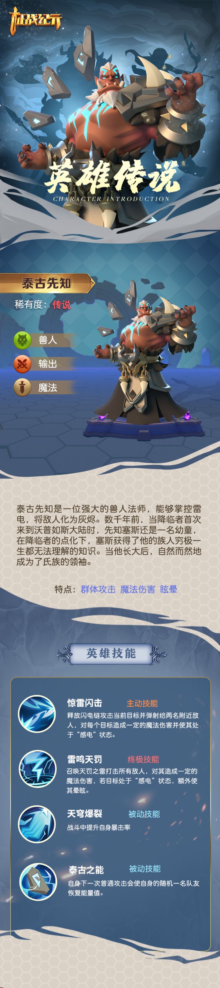各位亲爱的领主大大们端午小长假过得怎么样呢~薇薇安准时上岗报道来为大家介绍今日份的英雄传说!今天登场的是雷电掌控者——泰古先知!作为一名强大的兽人法师,也作为氏族领袖塞斯有着惊人的群攻伤害。在“感电”状态下,终极大招还将带来额外的眩晕效果!现在加入《征战纪元》官方交流群:951580141 关注公众号“征战纪元”还将解锁更多不定时福利哦!