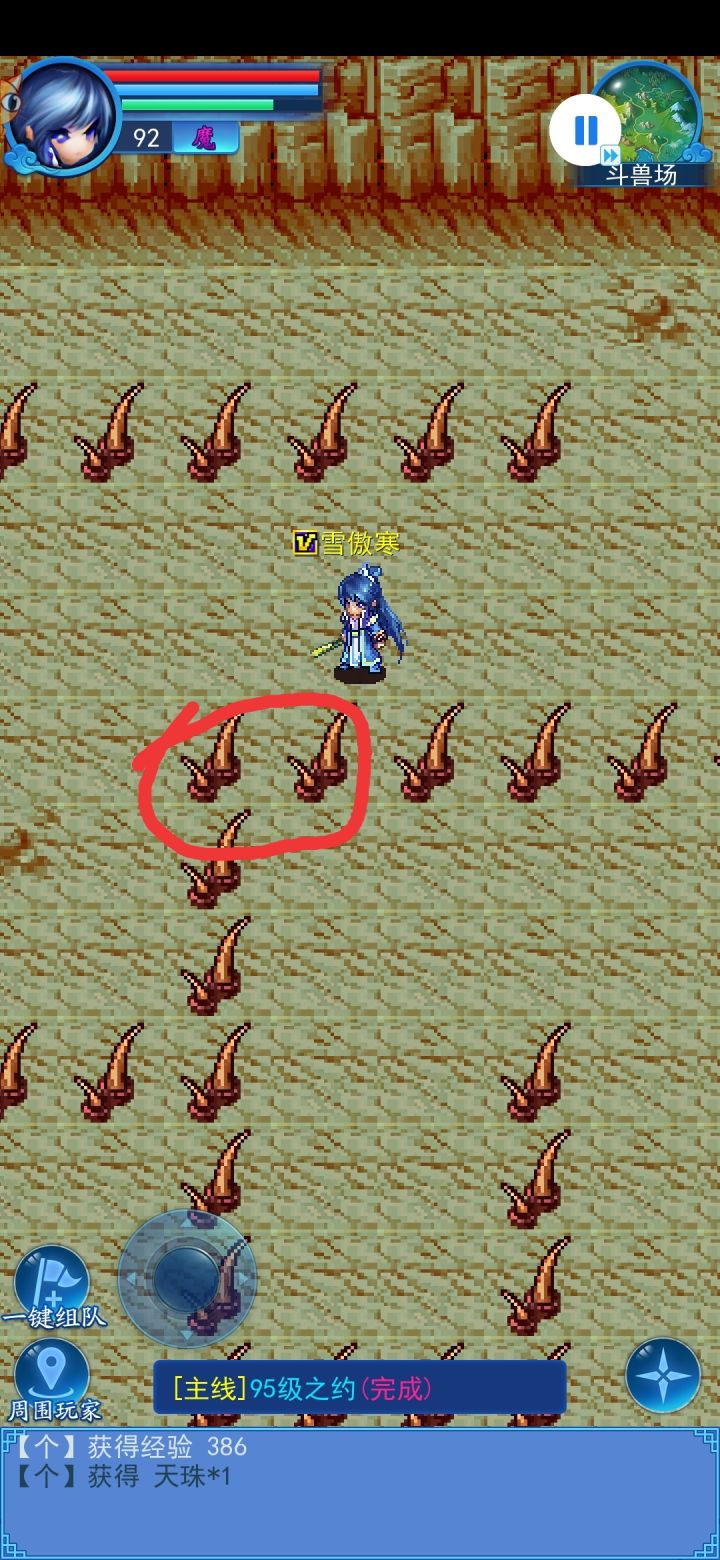Hello大家好这里是聪明又帅气,博学又多智的雪傲寒教学课堂。众所皆知,斗兽是一个能获得不少道具的好地方,那么有时候,我们看着“麒麟”或者“龙”就出在自己的下面,而自己因为隔了一堵墙过不去,或者过去了,而兽被别人打死了,那心情……想想就那啥,那么,接下来,我就要给大家介绍一下斗兽图的“穿墙技巧”。话不多说,直接上图基本的技巧嘛,就是手触那边的那块区域,然后让角色在我标的那块区域来回逛,就
