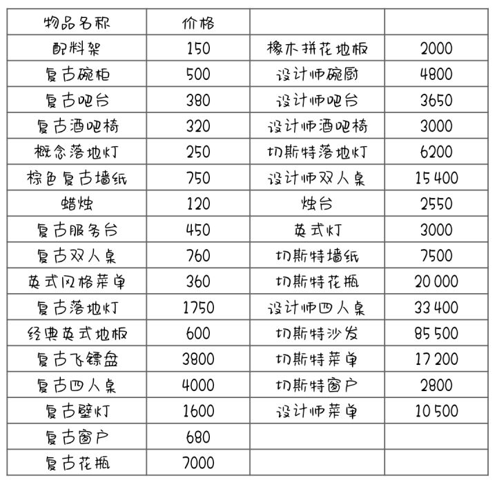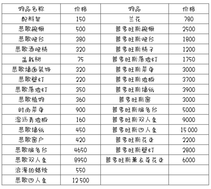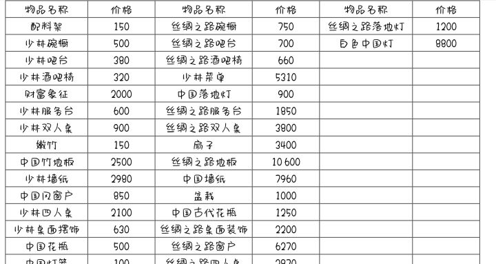 欢迎查缺补漏,目前才玩到13级很多东西都没解锁。买了的装饰又查看不了价格。弄个表方便寻找