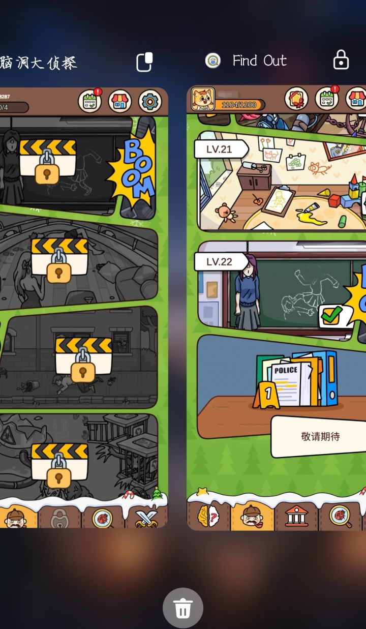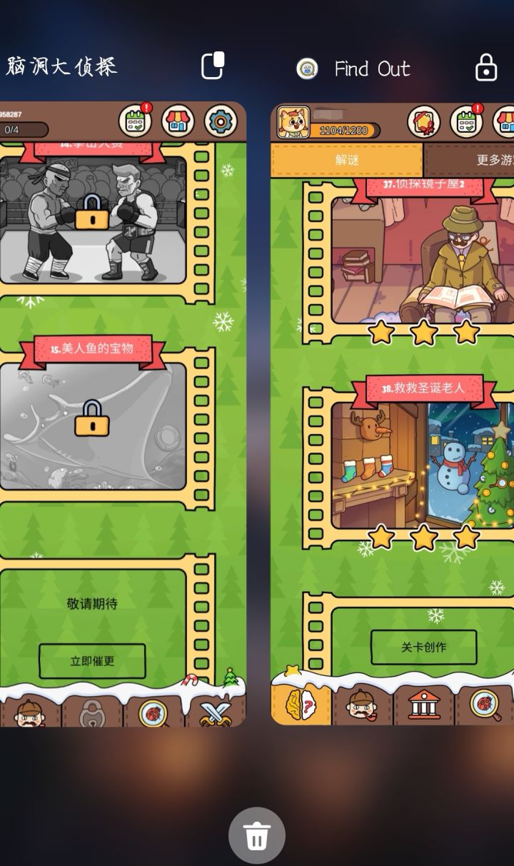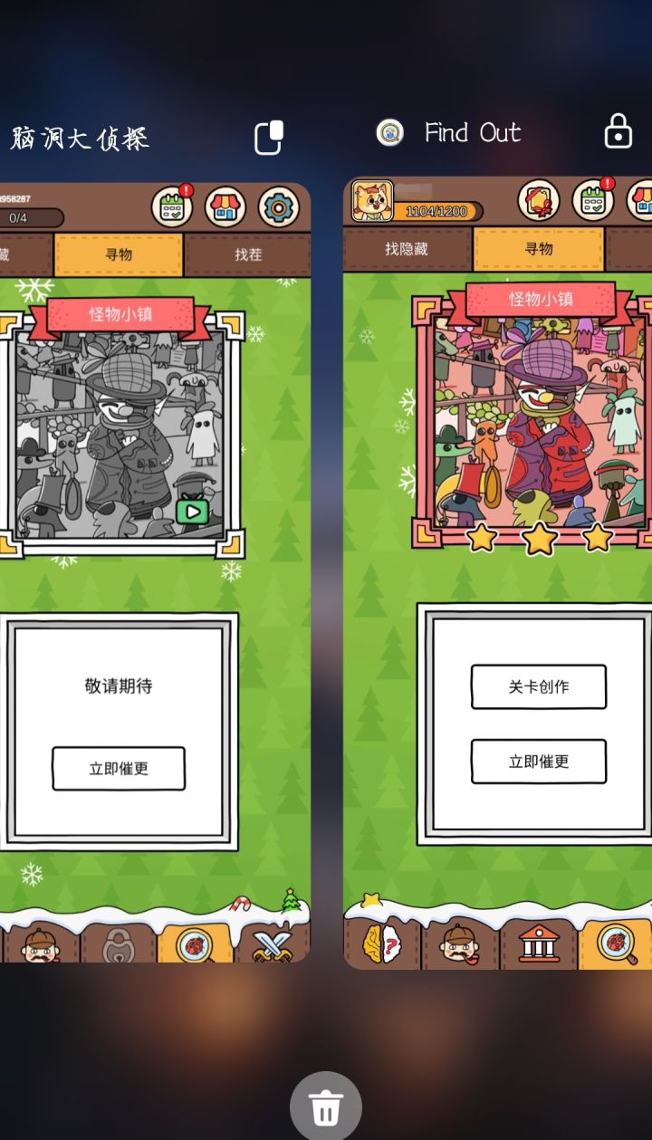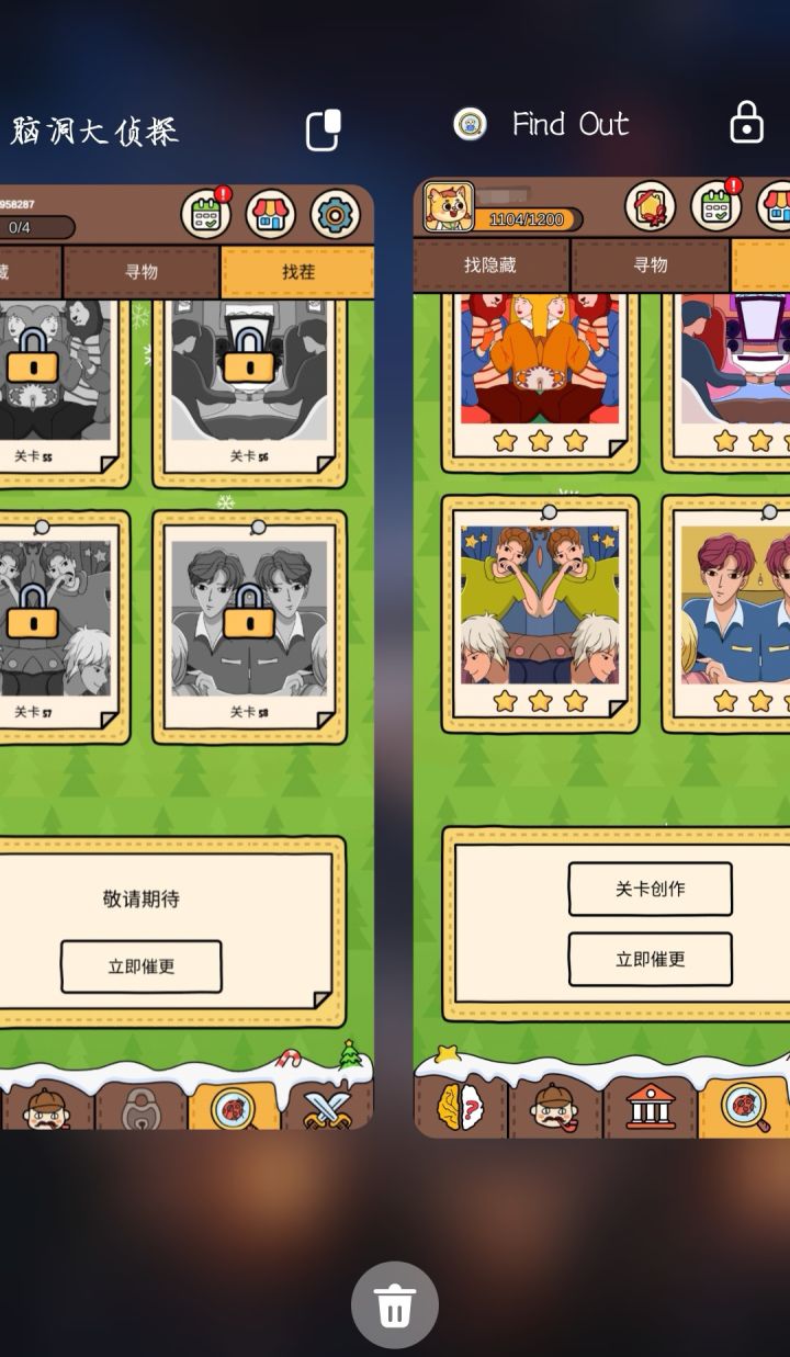 目前只发现“侦探模式”更新进度不一样,中文版更到第33关了,原版只有22关,其他“找隐藏”“寻物”“找茬”进度应该都是一样的。“解谜”因为要按时长等解锁才能对照所以不确定,我的Find Out上解谜的最新关卡是“38.救救圣诞老人”